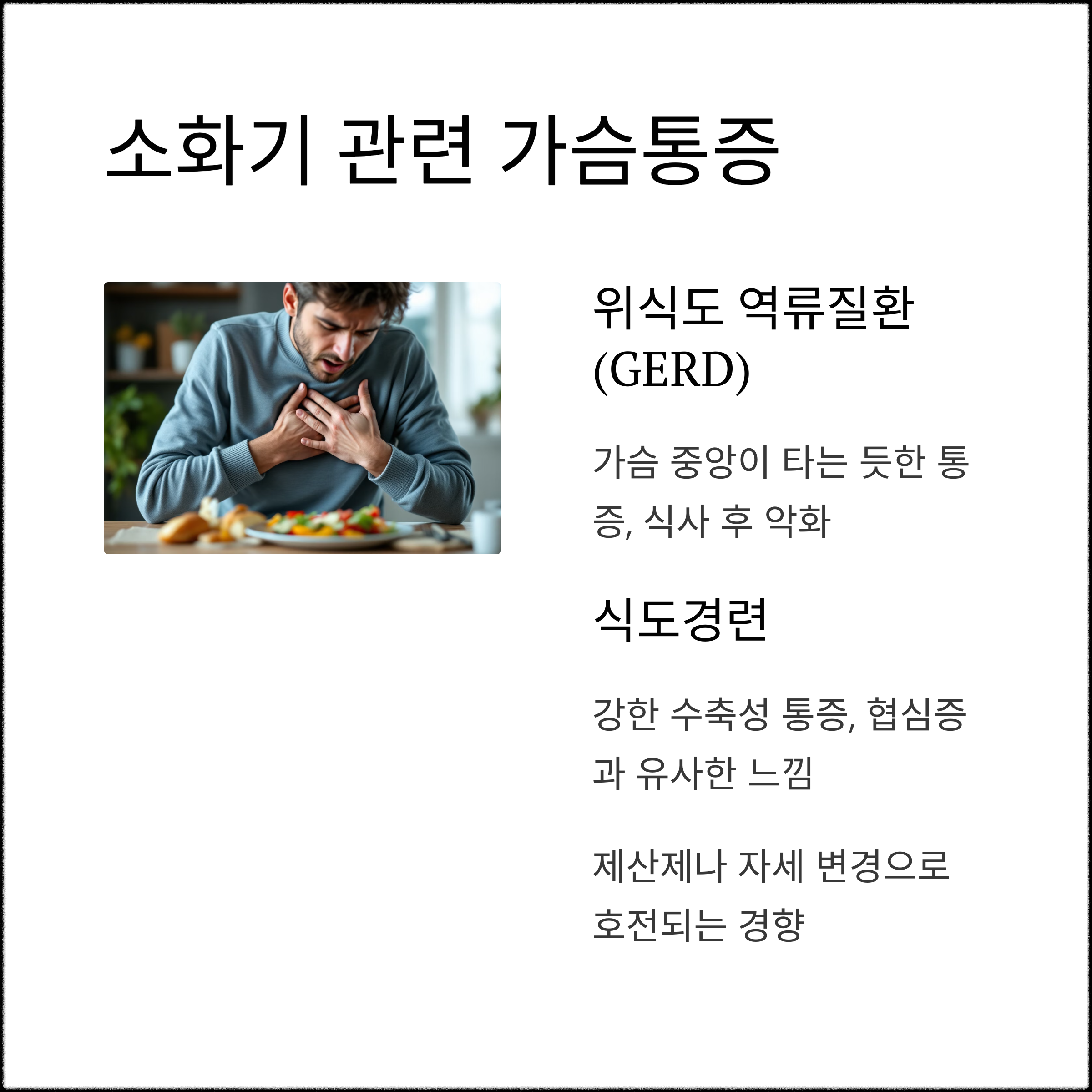 식도경련도 비슷한 증상을 보이지만 더 강한 수축 통증을 유발하고, 때로는 협심증과 유사하게 느껴져 감별이 필요합니다. 위장 관련 통증은 대개 제산제를 복용하거나 자세를 바꾸면 호전됩니다.