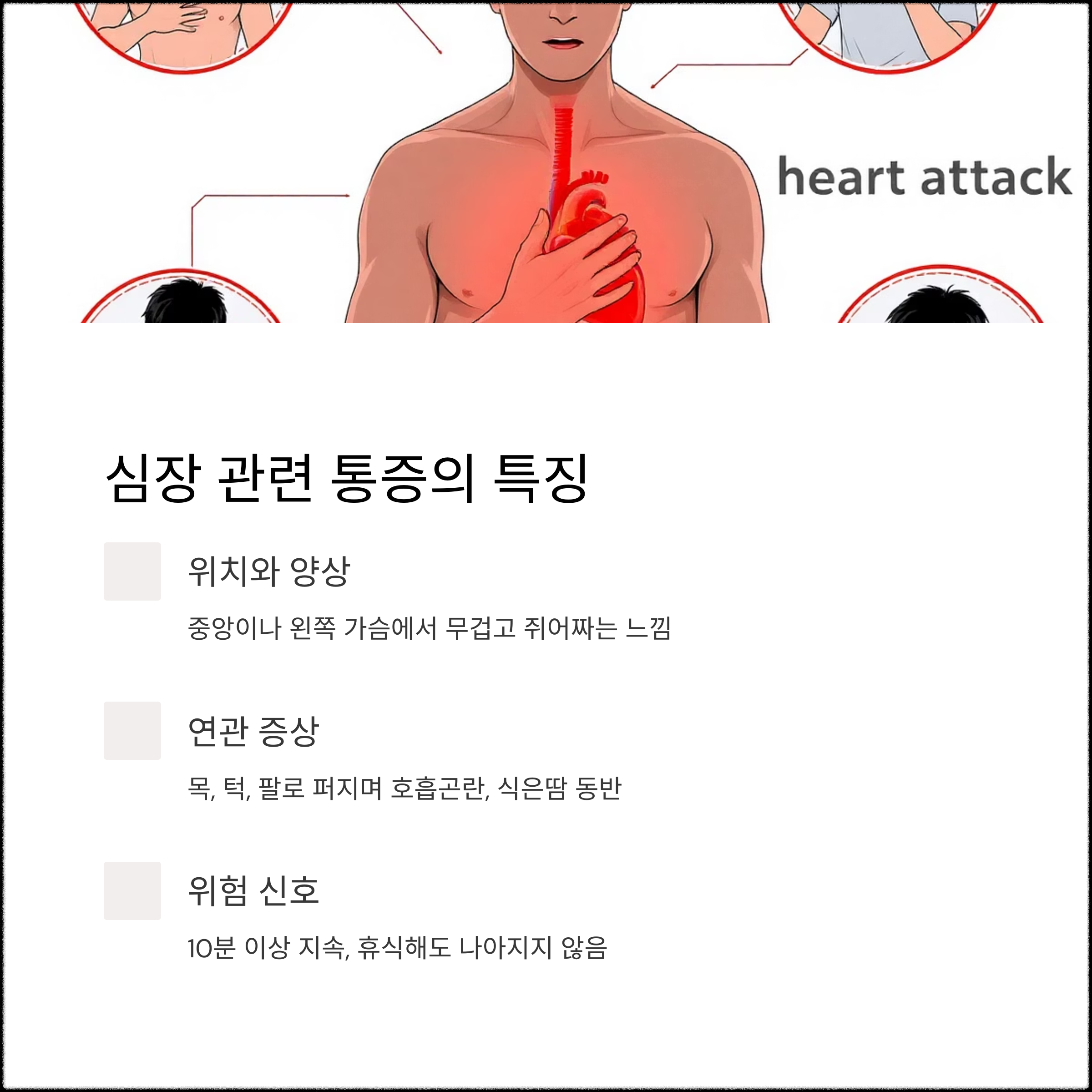 심장 문제로 인한 가슴통증은 대개 중앙이나 왼쪽 가슴에서 무겁고 쥐어짜는 듯한 느낌으로 나타납니다. 이 통증은 때로는 목, 턱, 팔, 등으로 퍼지며 호흡 곤란이나 식은땀을 동반하기도 합니다. 가장 대표적인 질환은 협심증과 심근경색입니다.