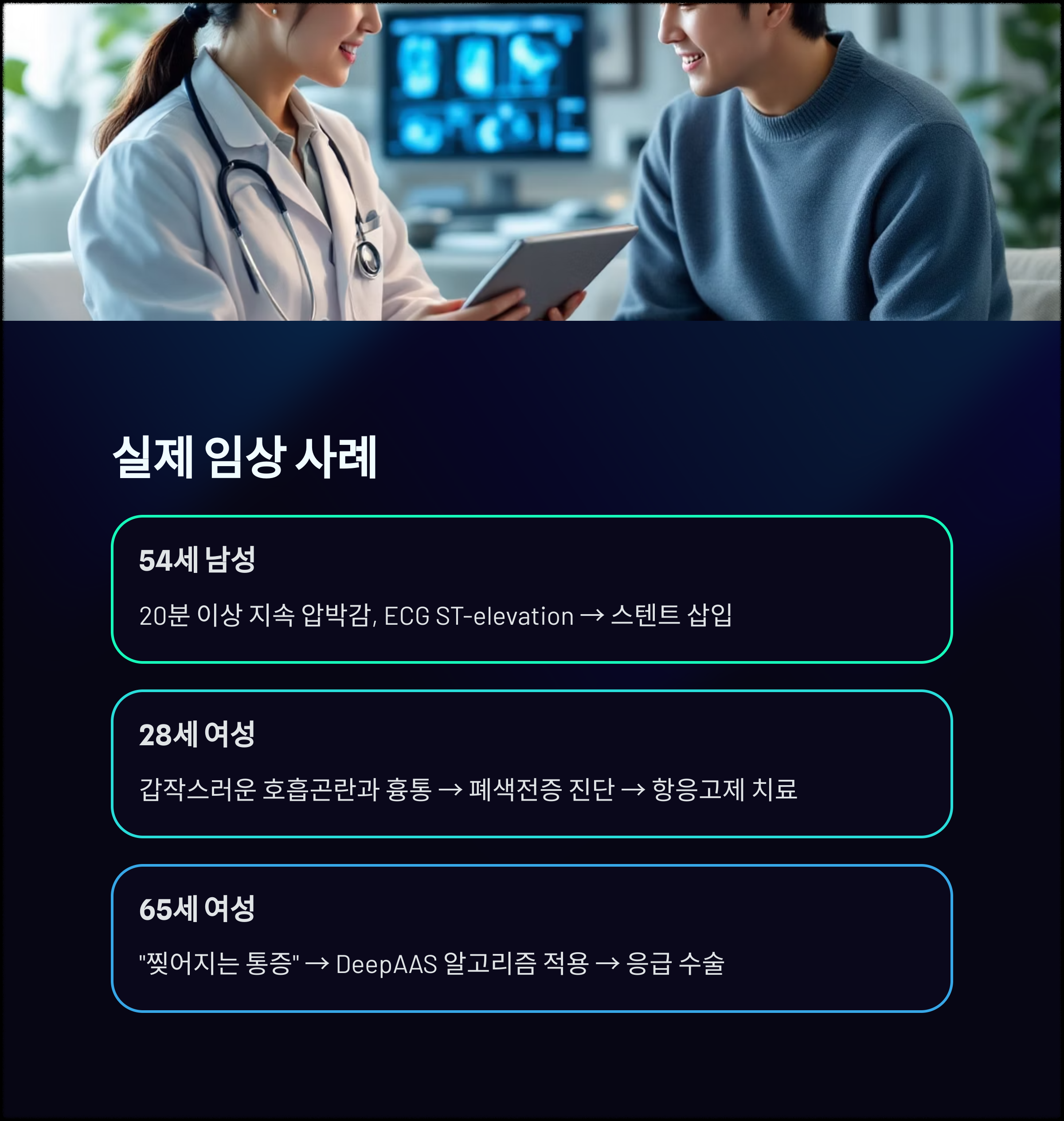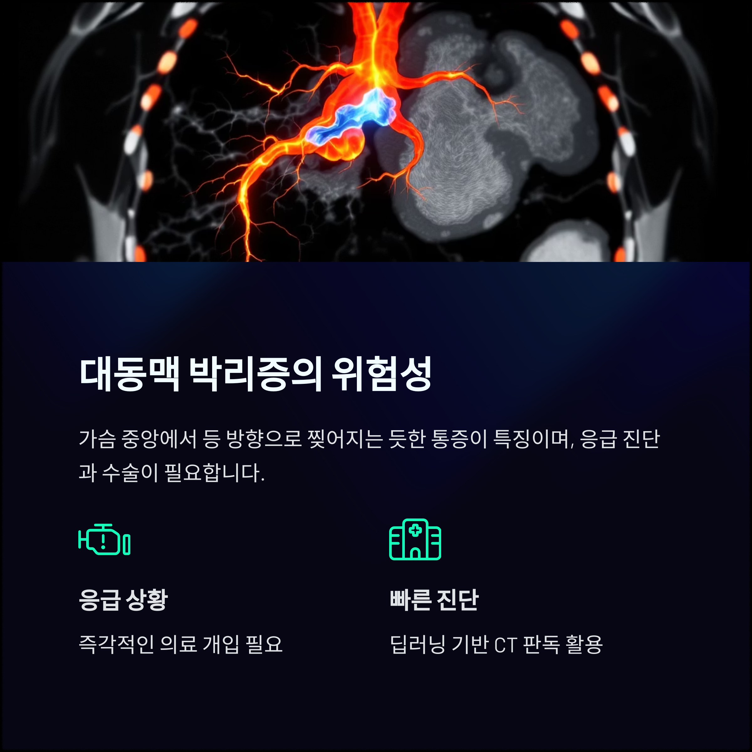 - 혈압 차이 동반, 비조영 CT DeepAAS 알고리즘 적용 → AAS 확진 → 응급 수술 진행