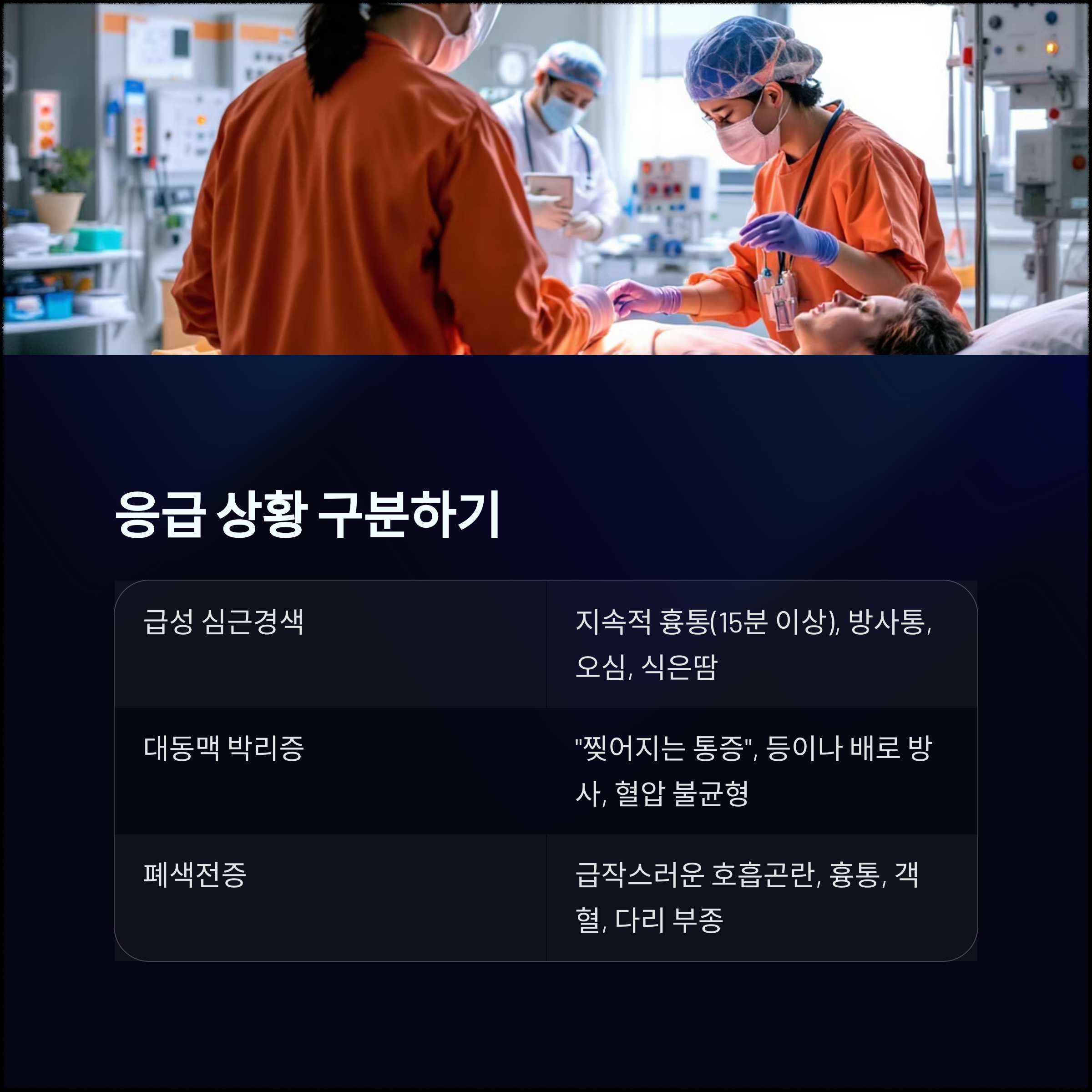 다음은 생명을 위협할 수 있는 응급 질환과 특징을 비교한 표입니다:
