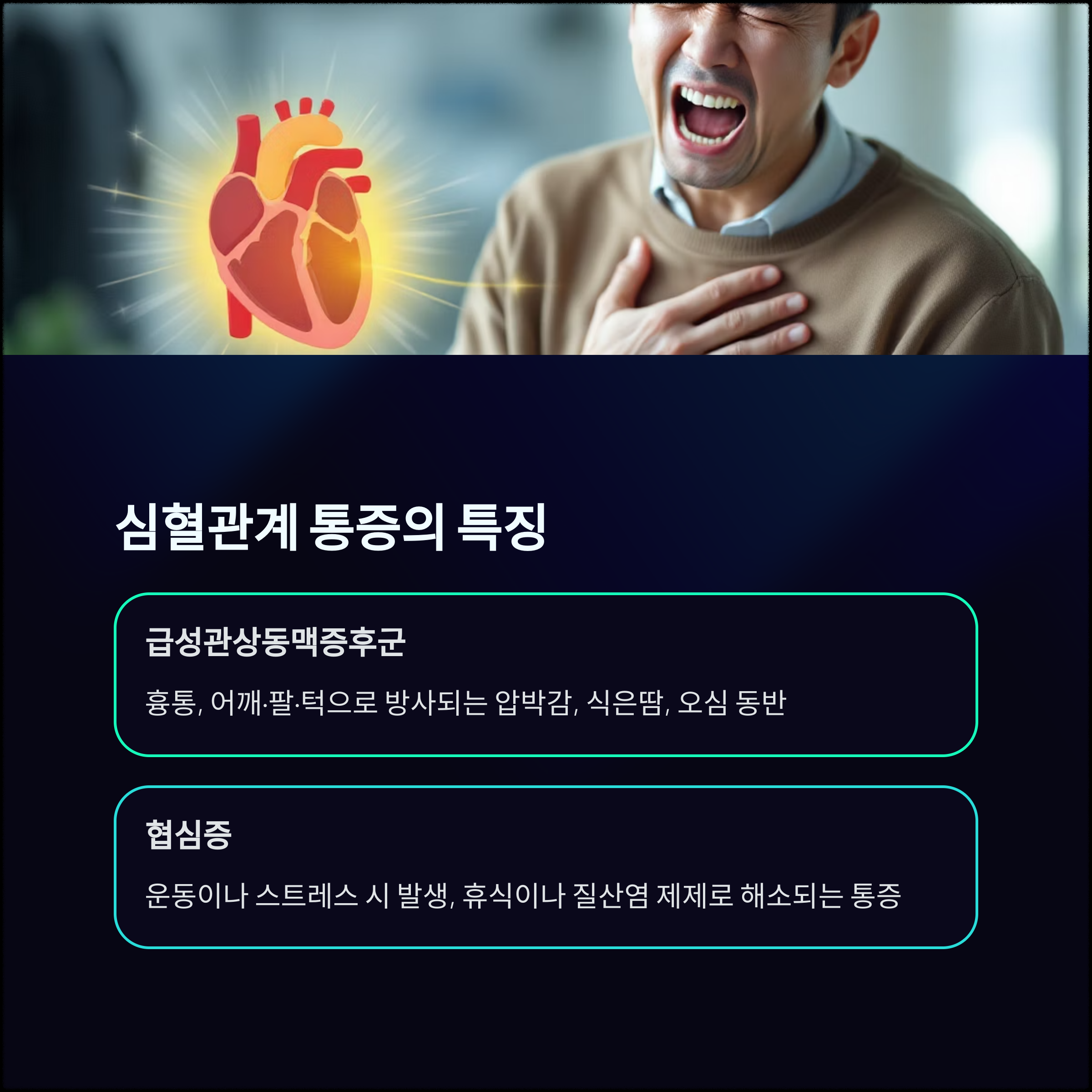 | 급성 심근경색(STEMI 등) | 지속적인 흉통(15분 이상), 방사통(팔·턱), 오심·식은땀, 매우 불안정한 기색 |
