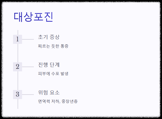 대상포진이 가슴 주변에 발생할 경우, 신경을 따라 찌르는 듯한 통증이 생길 수 있습니다. 초기에는 단순한 흉통으로 오해하기 쉬우며, 수포가 나타나기 전까지는 진단이 어렵습니다.