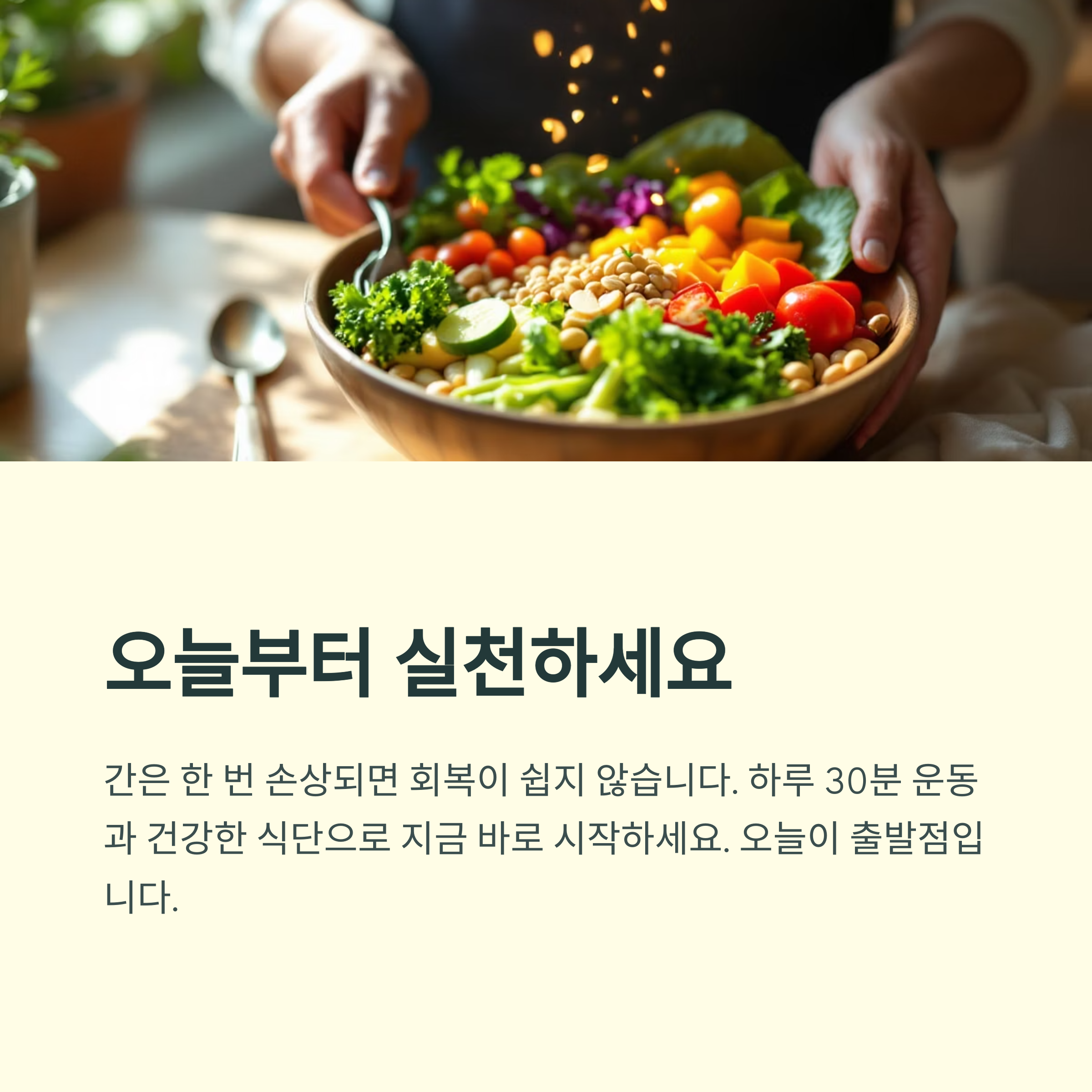 간은 한 번 손상되면 회복이 쉽지 않기 때문에 조기에 예방하고 관리하는 것이 최선의 전략입니다. 오늘 배운 내용을 바탕으로 하루 30분 유산소 운동을 실천하고, 건강한 식단을 준비해 보세요. 또 간 건강에 도움이 되는 성분이 포함된 식품이나 건강기능식품을 전문가와 상담한 후 꾸준히 챙기는 것도 좋은 방법입니다. 가장 중요한 것은 일상에서의 꾸준한 실천입니다. 지금 바로 실천하는 작은 행동이 10년 후 건강한 삶의 질을 결정하게 됩니다. 건강은 타이밍입니다. 오늘이 그 출발점이라는 것, 절대 잊지 마세요.