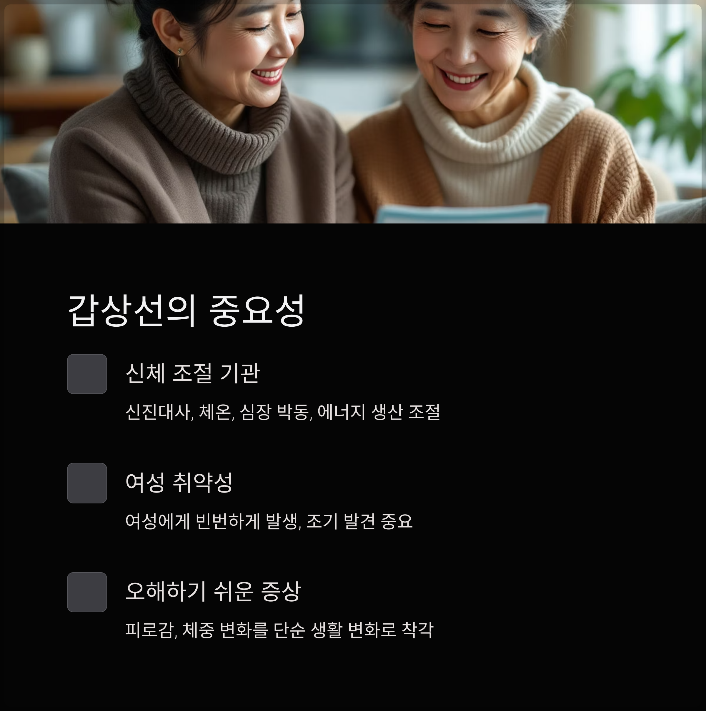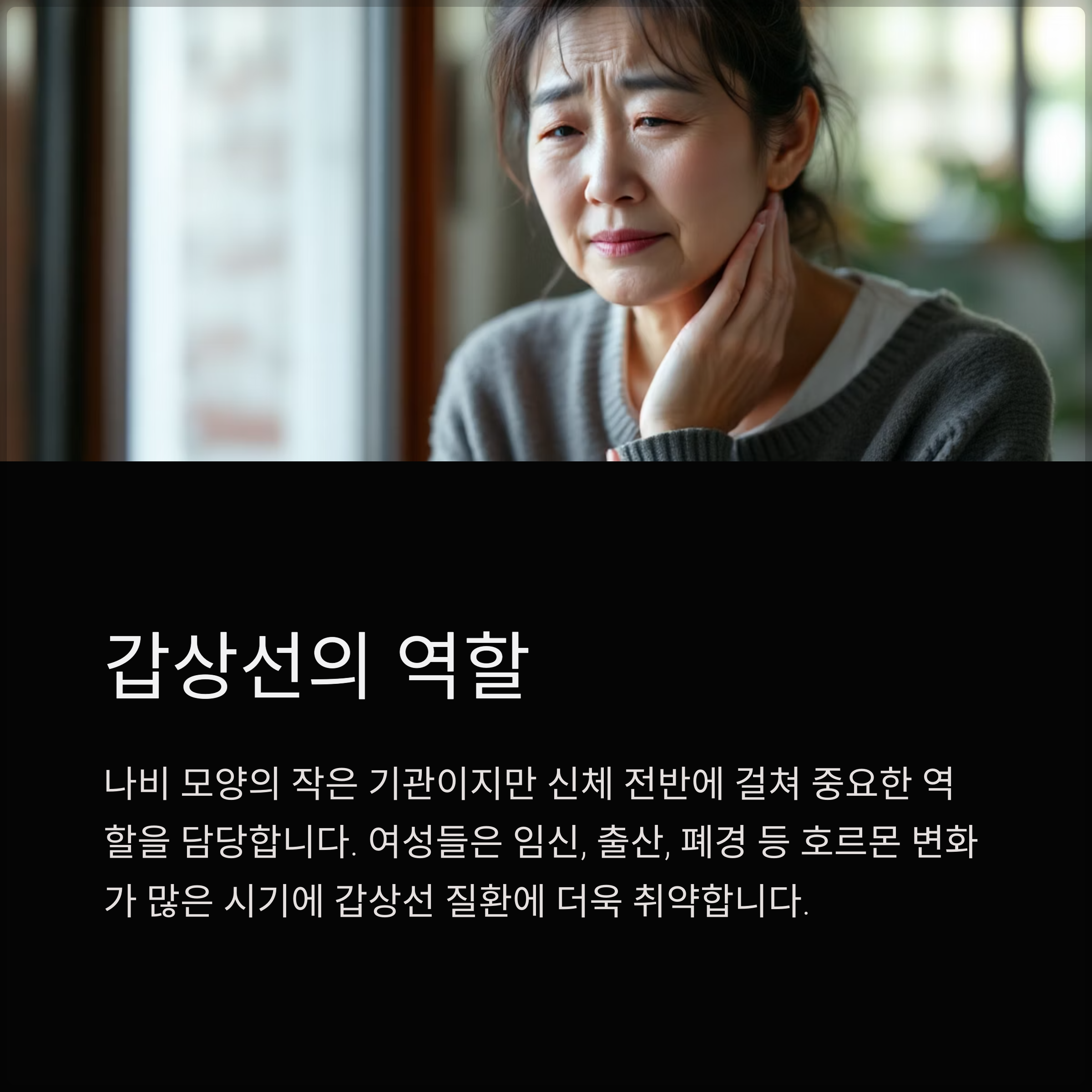 갑상선은 목 앞쪽에 위치한 나비 모양의 작은 기관이지만 신체 전반에 걸쳐 중요한 역할을 담당합니다. 갑상선 호르몬은 신진대사, 체온 조절, 심장 박동, 에너지 생산 등 다양한 기능에 관여합니다. 특히 여성들은 임신, 출산, 폐경 등 호르몬 변화가 많은 생애 주기에서 갑상선 질환에 취약해질 수 있습니다. 따라서 조금이라도 의심 증상이 느껴진다면 빠른 검진이 필요합니다.