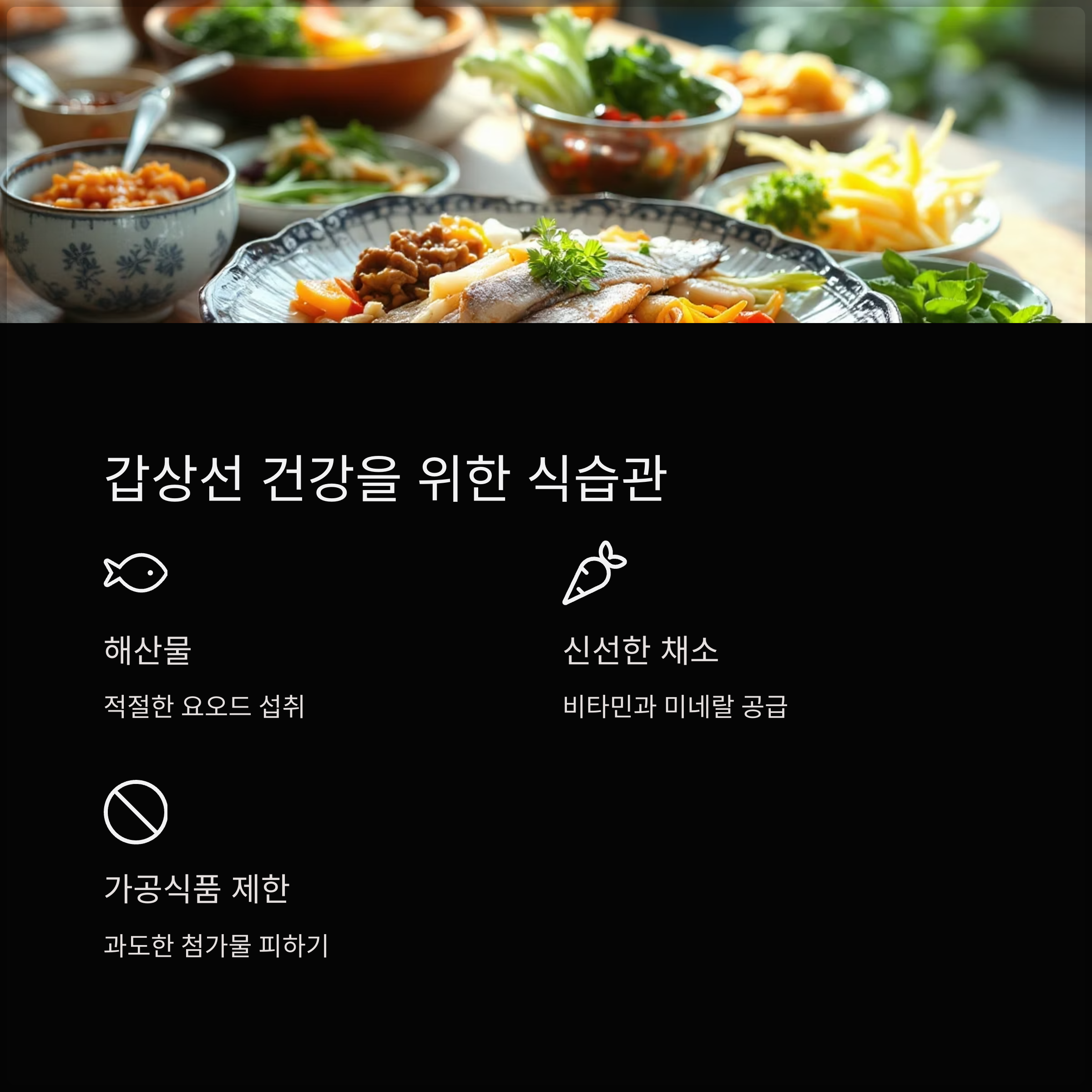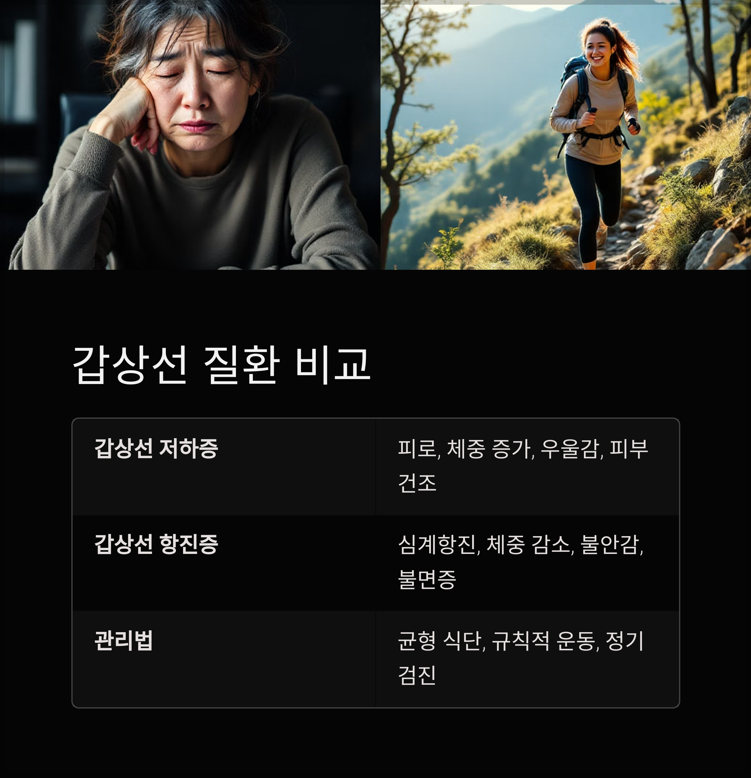 피로, 체중 증가, 우울감, 피부 건조 | 심계항진, 체중 감소, 불안감, 불면증 | 균형 잡힌 식단, 규칙적인 운동, 스트레스 관리 |