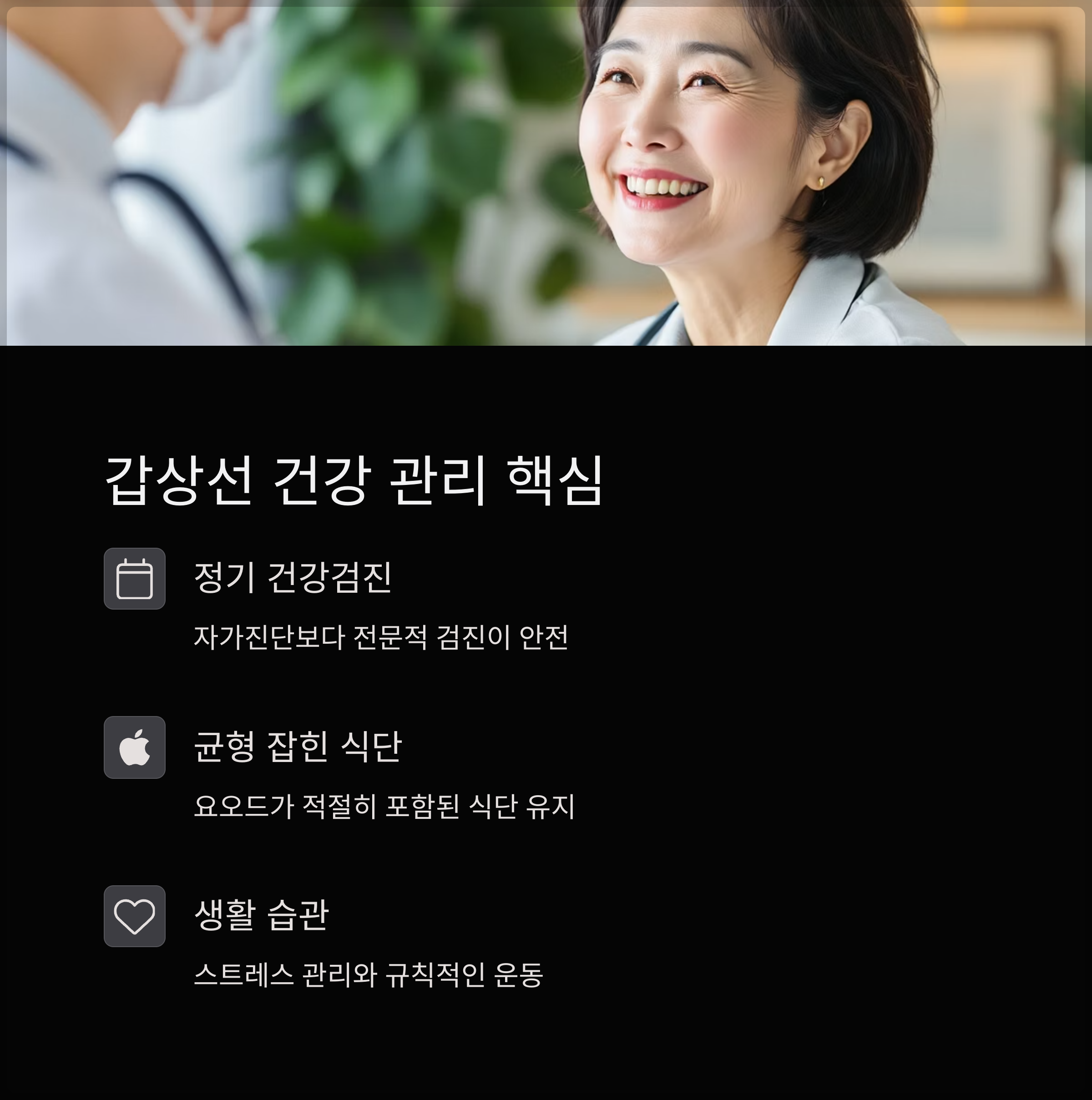 갑상선 질환은 증상이 다양하고 개인차가 크기 때문에 자가 진단보다는 정기 건강검진과 전문적인 상담을 통해 확인하는 것이 가장 안전합니다. 또한 균형 잡힌 식단과 스트레스 관리, 규칙적인 운동이 갑상선 건강 유지에 많은 도움이 됩니다. 작은 변화도 예민하게 관찰하여 건강한 삶을 지켜나가시길 바랍니다.