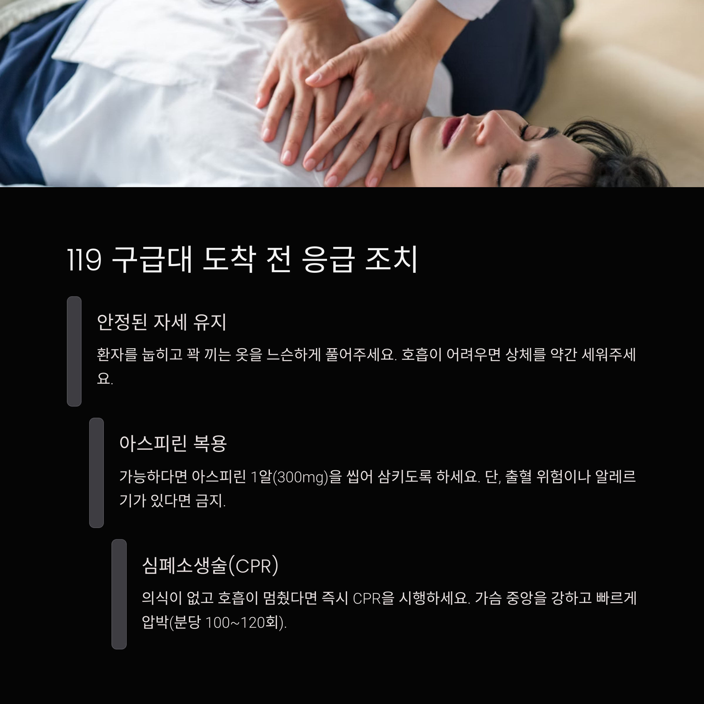 가능하다면 아스피린 1알(300mg 내외) 을 씹어 삼키도록 하는 것도 도움이 됩니다. 단, 환자가 출혈 위험이 있거나 알레르기가 있다면 복용하지 않도록 해야 합니다.