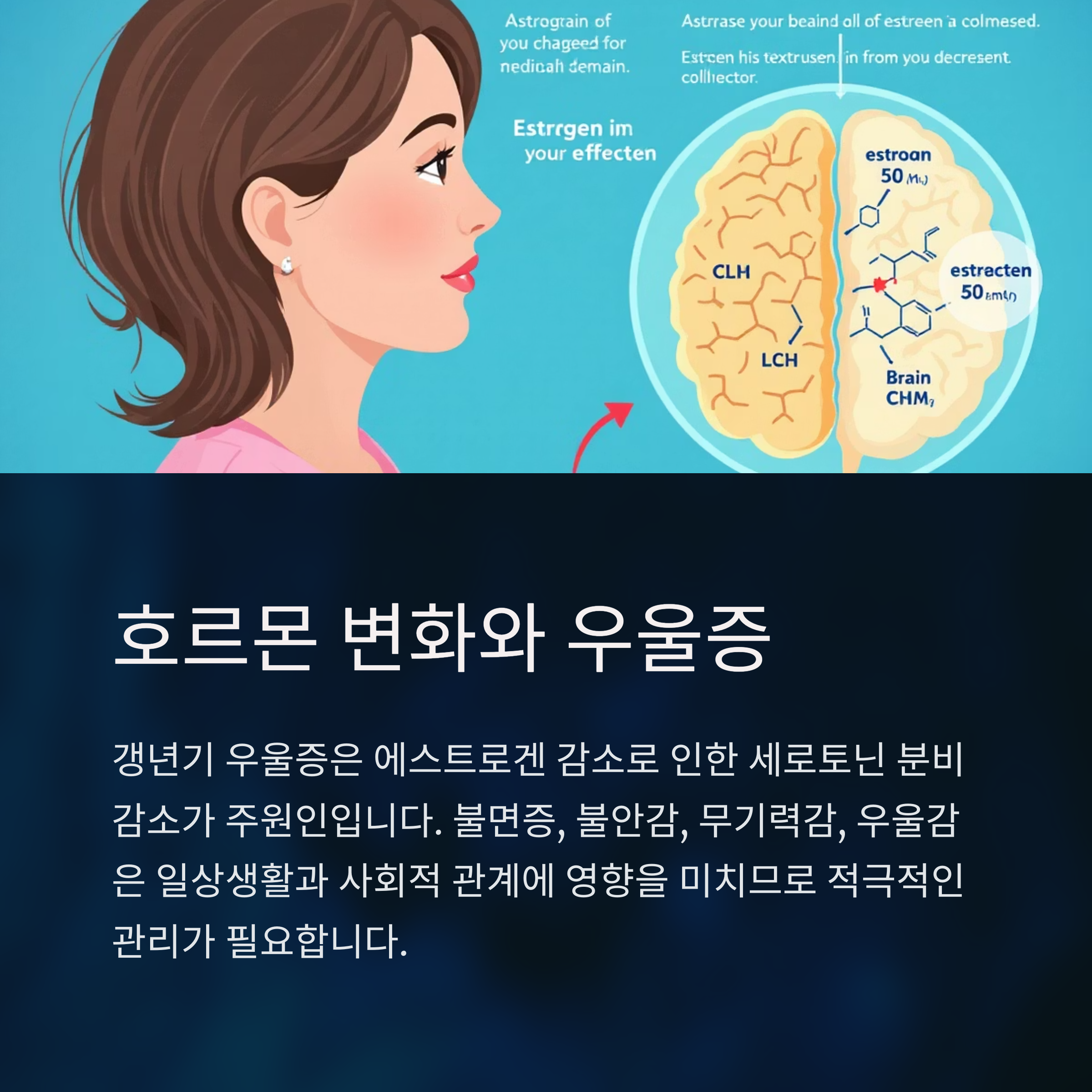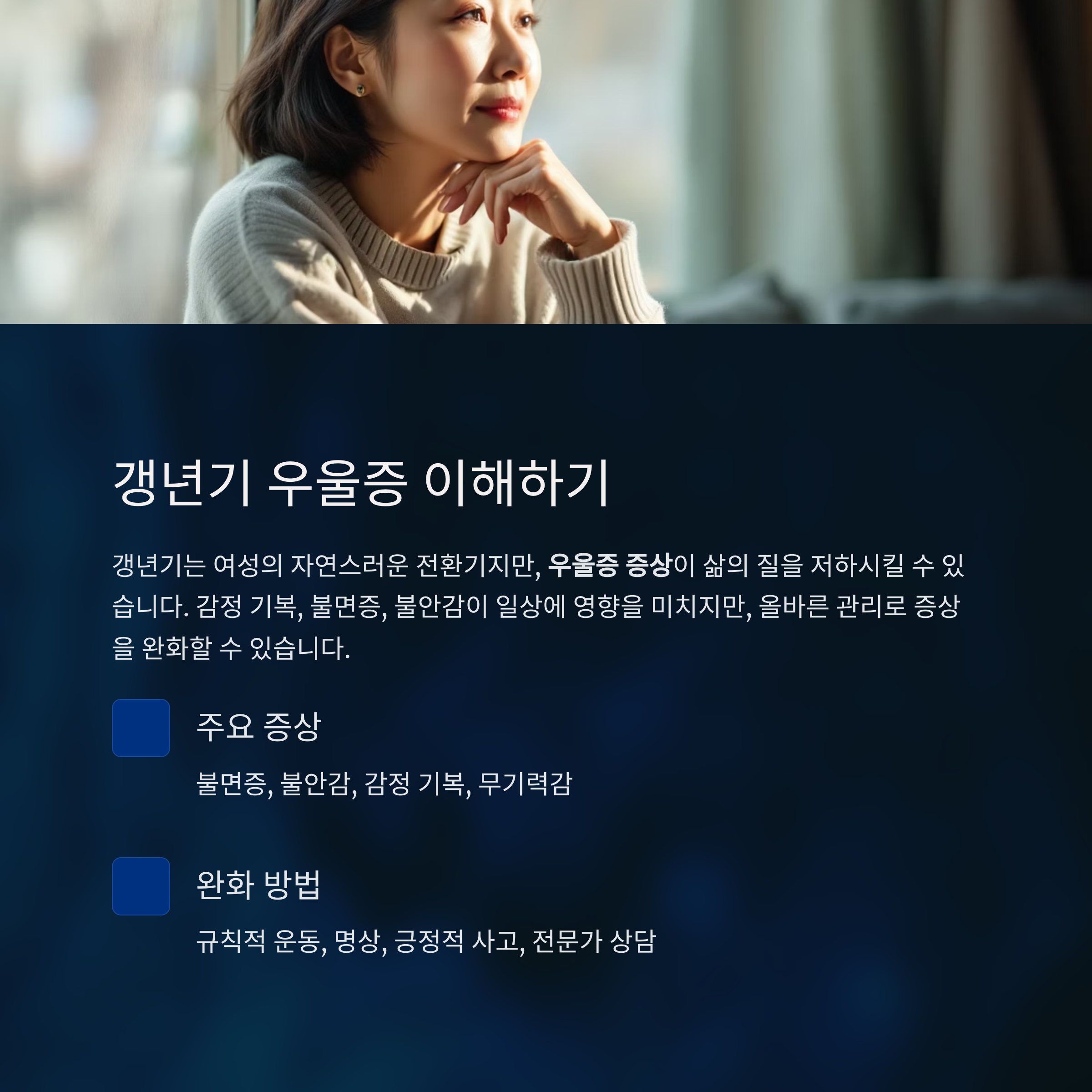 | 갱년기 우울증 주요 증상 | 불면증, 불안감, 감정 기복, 무기력감 등이 나타납니다. |