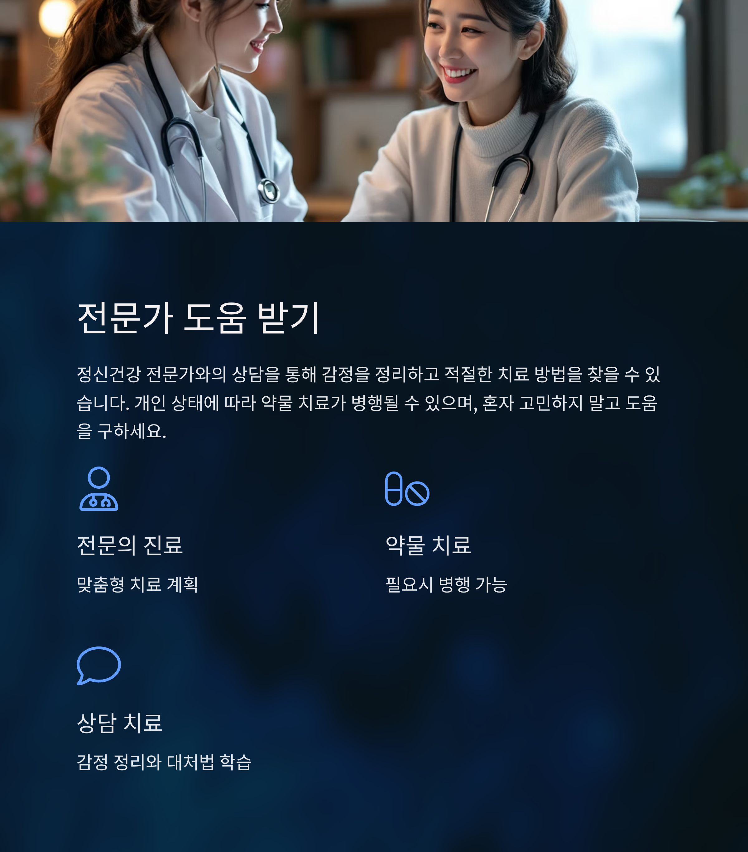 필요하다면 전문가 상담을 고려해보는 것도 중요합니다. 정신건강 전문가와의 상담을 통해 감정을 정리하고 적절한 치료 방법을 찾을 수 있습니다. 경우에 따라 약물 치료가 병행되기도 하며, 이는 개인의 상태에 따라 맞춤형으로 진행됩니다. 무엇보다 혼자 고민하지 않고 적극적으로 도움을 받는 자세가 필요합니다.