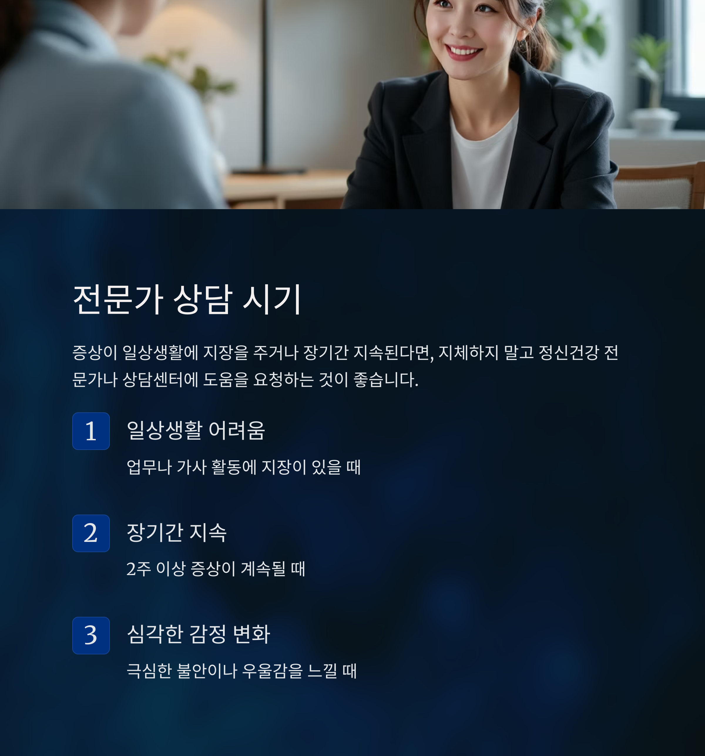 | 증상 완화 방법 | 규칙적인 운동, 명상, 긍정적 사고 훈련, 전문가 상담 |