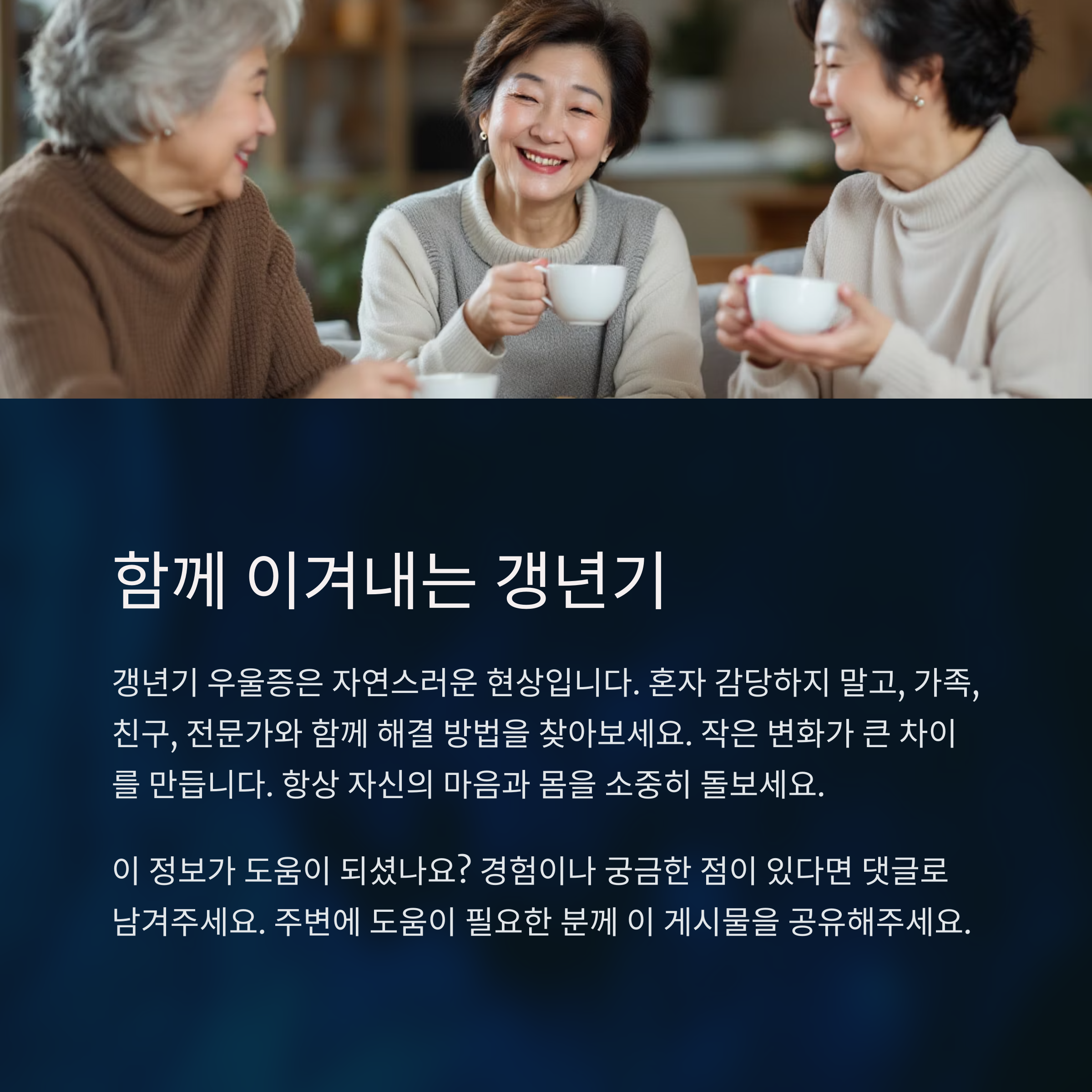 오늘 포스팅이 도움이 되셨나요? 갱년기 우울증 관련 경험이나 궁금한 점이 있다면 댓글로 남겨주세요. 여러분의 이야기가 다른 분들에게도 큰 도움이 될 수 있습니다.
