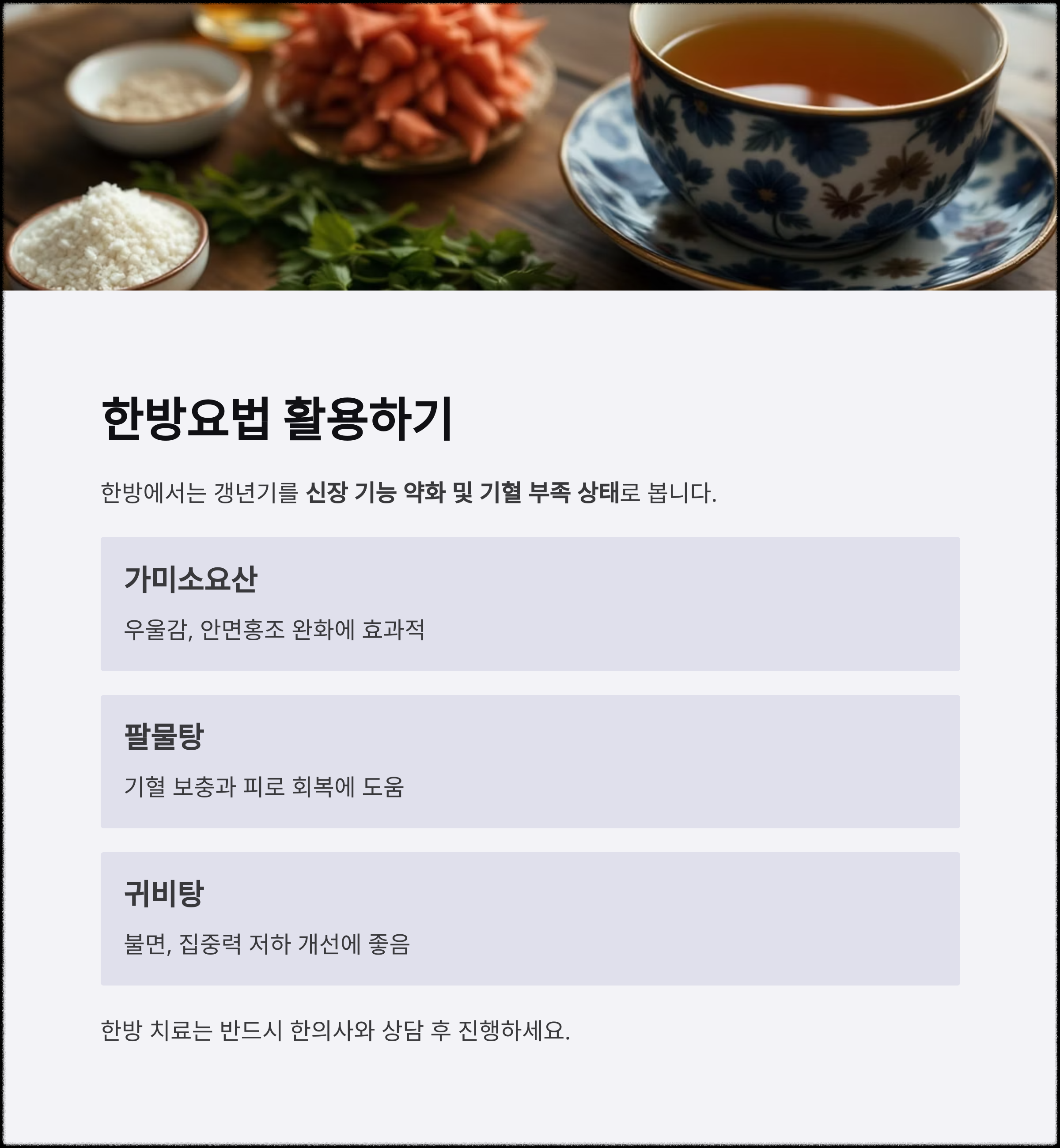 한방에서는 갱년기를 신장 기능 약화 및 기혈 부족 상태로 봅니다.