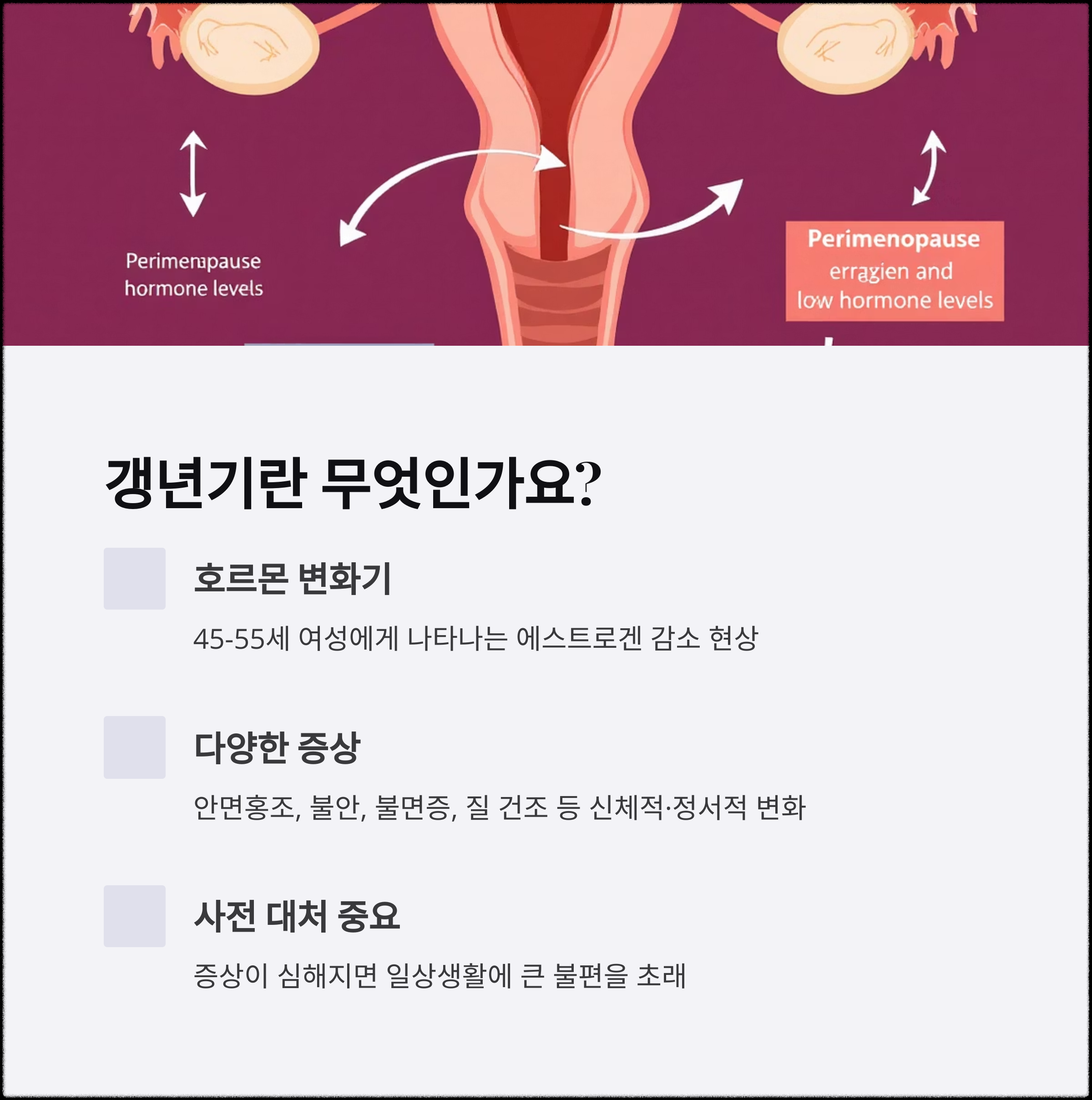 갱년기는 일반적으로 45세에서 55세 사이의 여성에게 나타나는 호르몬 변화기로, 난소 기능 저하로 인해 에스트로겐이 급격히 줄어듭니다.