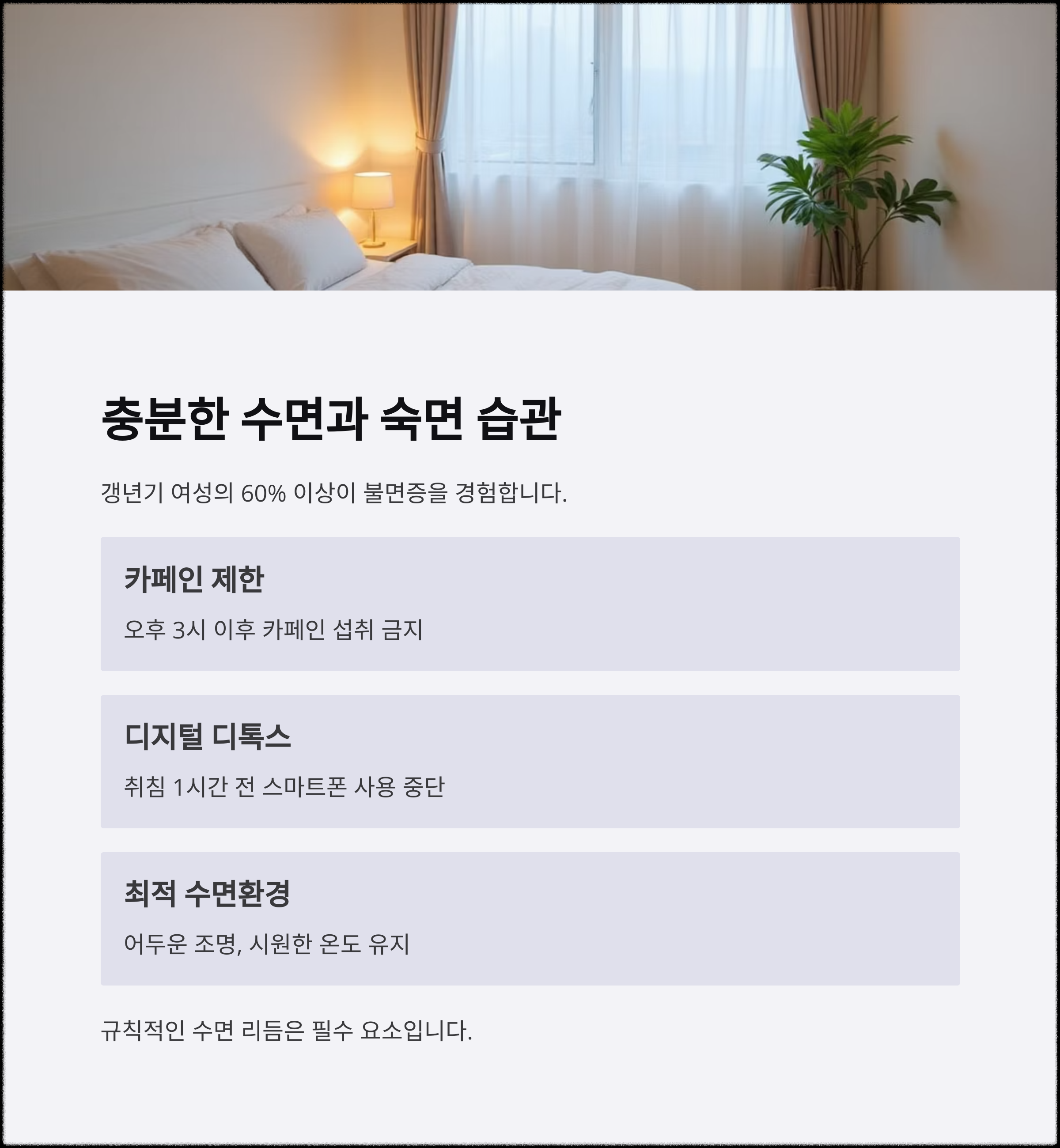 규칙적인 수면 리듬과 수면 위생(수면 환경 정리)은 반드시 실천해야 할 필수 요소입니다.
