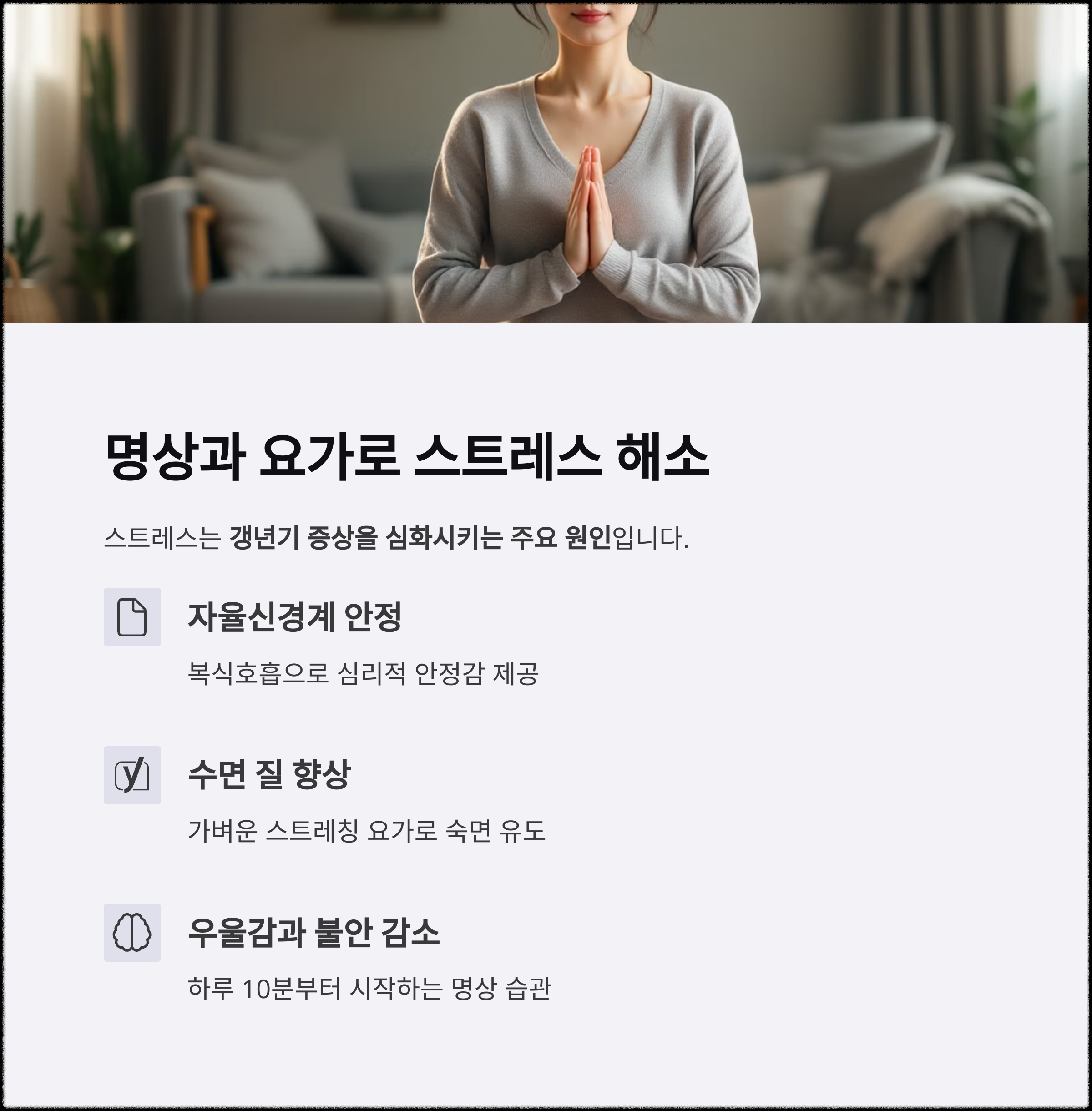 명상과 요가는 복식호흡과 함께 심리적 안정을 주며, 갱년기 우울감과 불안을 줄이는 데 긍정적인 영향을 줍니다.