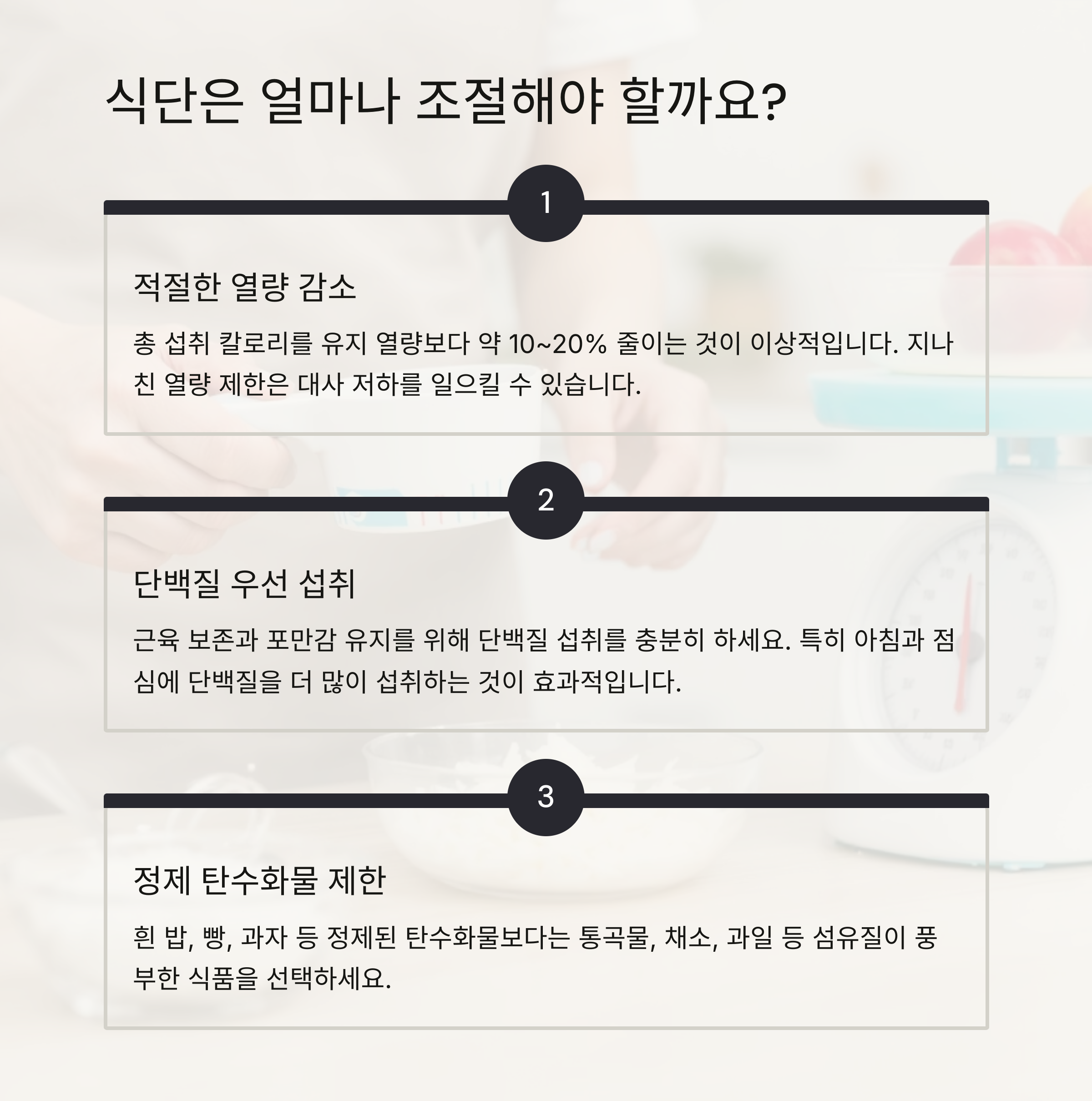 열량 적자 유지, 영양 균형, 근력 운동 병행 | 하루 30분 걷기, 단백질 중심 식사, 물 2L 이상 | 수면 관리, 루틴화, 감정 섭식 관리 |