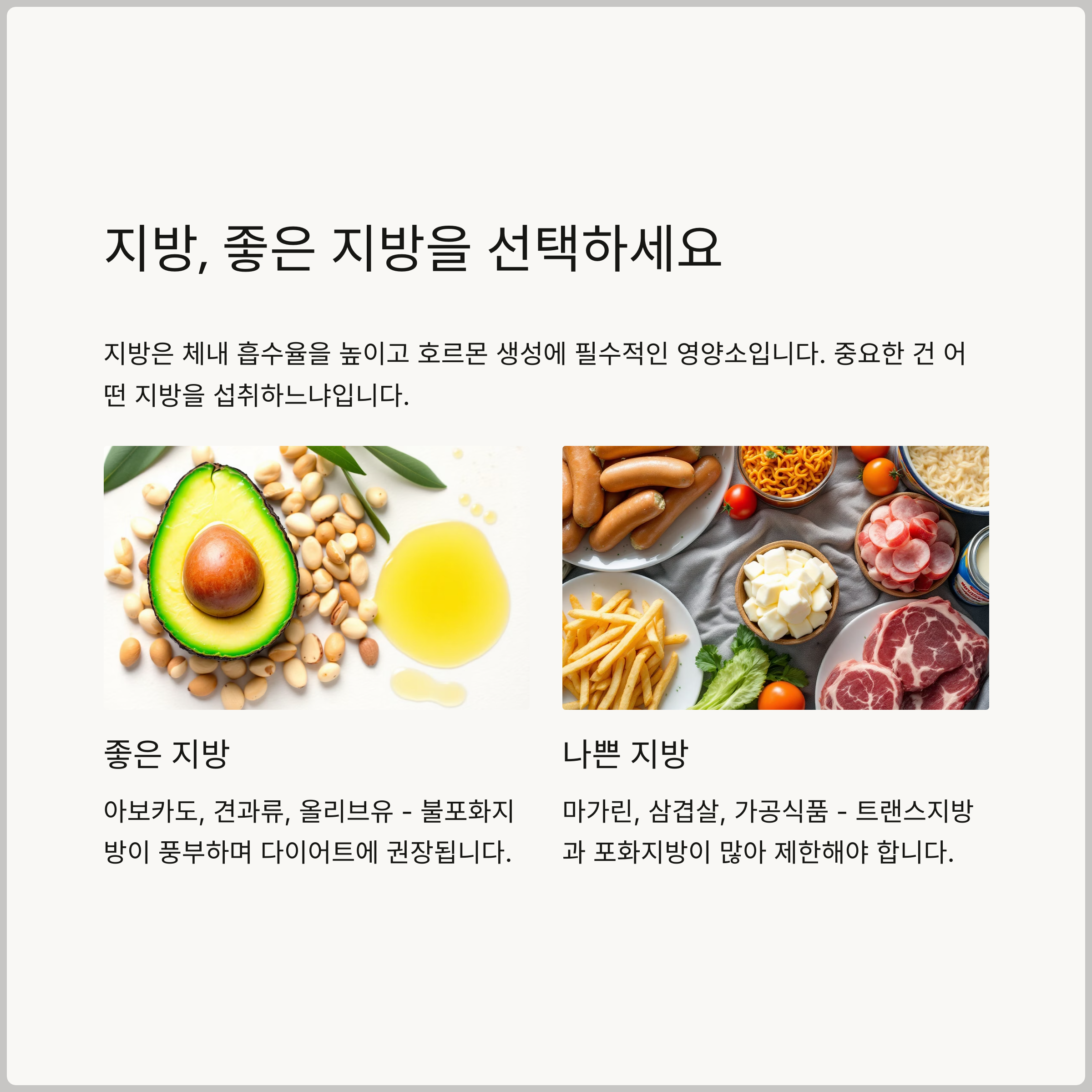 지방은 체내 흡수율을 높이고 호르몬 생성에 필수적인 영양소입니다.