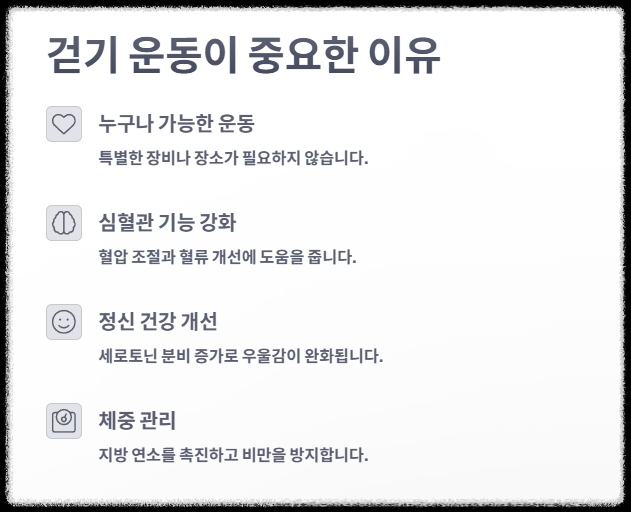 걷기는 누구나 쉽게 시작할 수 있는 최고의 유산소 운동이에요. 특별한 장비나 장소가 필요하지 않고, 우리 몸 전체를 부드럽게 자극해주죠. 특히 심장과 혈관 건강에 아주 탁월한 효과가 있어서, 꾸준한 걷기는 뇌졸중뿐 아니라 고혈압, 당뇨, 심장질환 등의 위험도 낮춰준답니다. 게다가 걷기 운동은 스트레스 해소와 정신 건강에도 매우 긍정적인 영향을 준다는 사실, 알고 계셨나요?