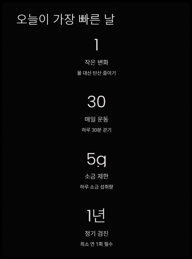 오늘 이 글을 읽으셨다면 지금 당장 하나라도 실천해보세요. 물 대신 탄산 줄이기, 엘리베이터 대신 계단 오르기, 짜게 먹는 식습관을 바꾸는 것이 시작입니다. 건강은 내일이 아닌 오늘 지켜야 합니다. 이 글을 닫기 전에 혈압부터 체크해보세요.
