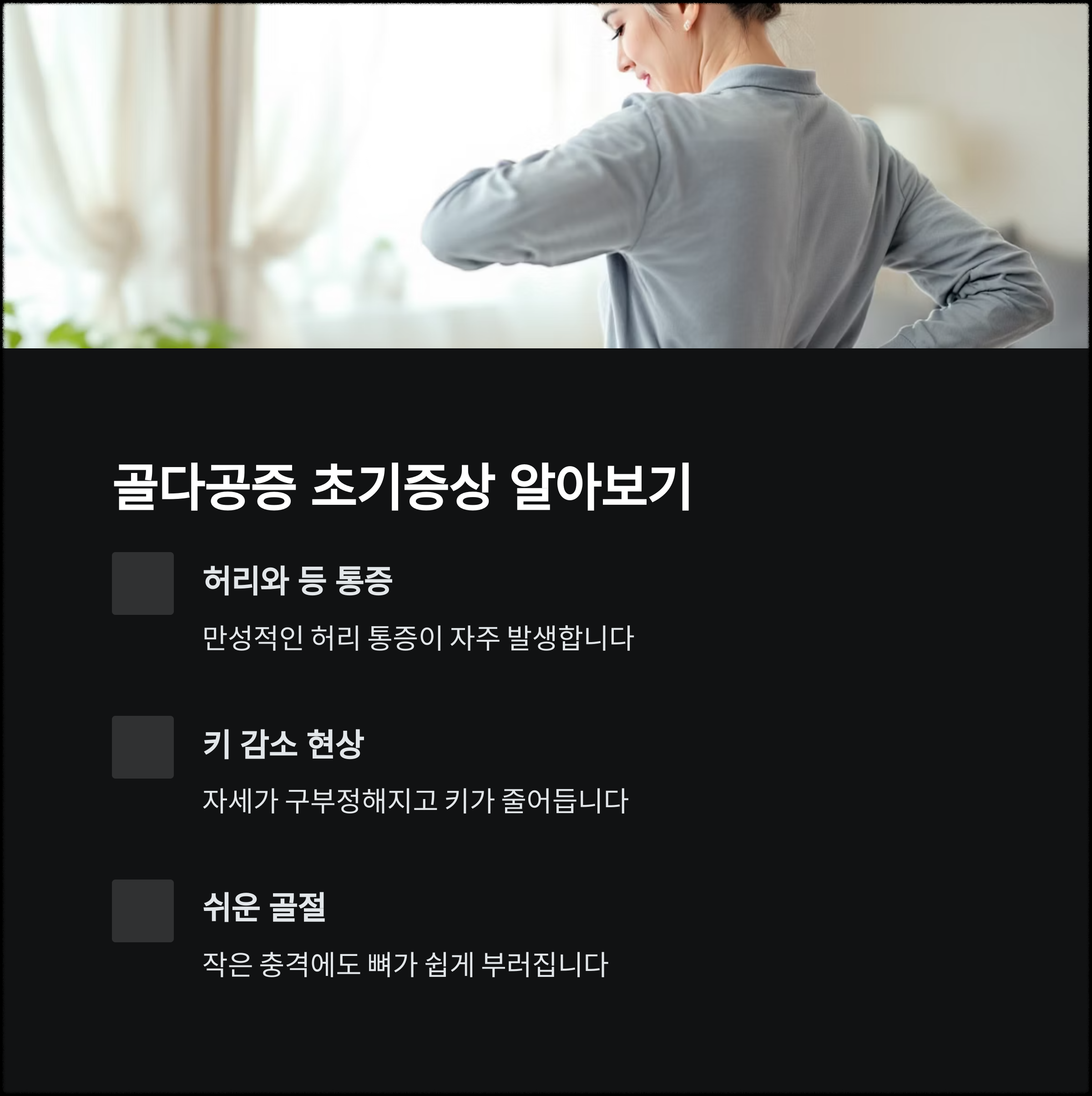 골다공증 초기증상 | 허리 통증, 키 감소, 쉽게 골절되는 증상 등이 있습니다. |