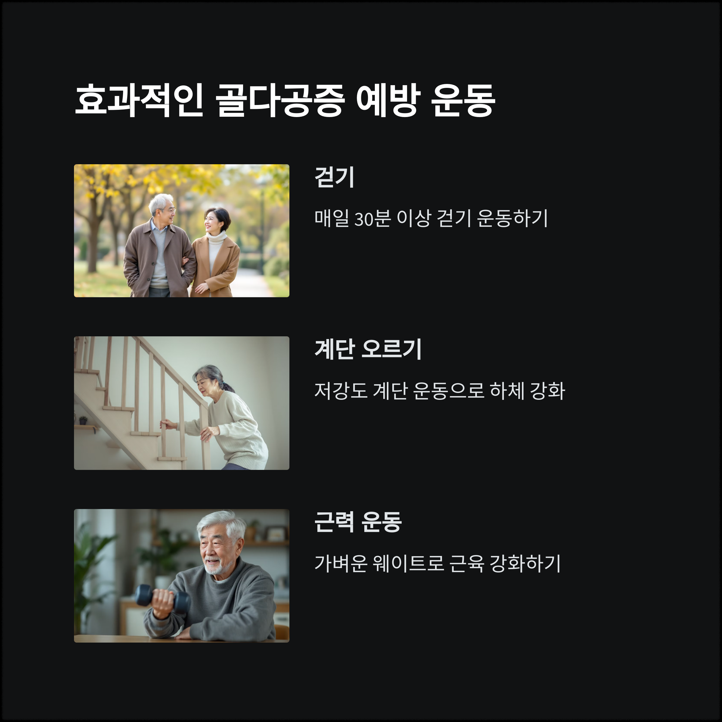 골다공증을 예방하기 위해서는 무엇보다 꾸준한 생활습관이 중요합니다. 우선 칼슘과 비타민 D가 풍부한 식품을 섭취하는 것이 좋습니다. 유제품, 두부, 연어, 견과류 등이 도움이 됩니다. 또한 규칙적인 근력 운동과 유산소 운동을 병행하면 뼈 건강 유지에 효과적입니다. 햇볕을 자주 쬐어 비타민 D를 자연적으로 합성하는 것도 중요한 예방 방법입니다.