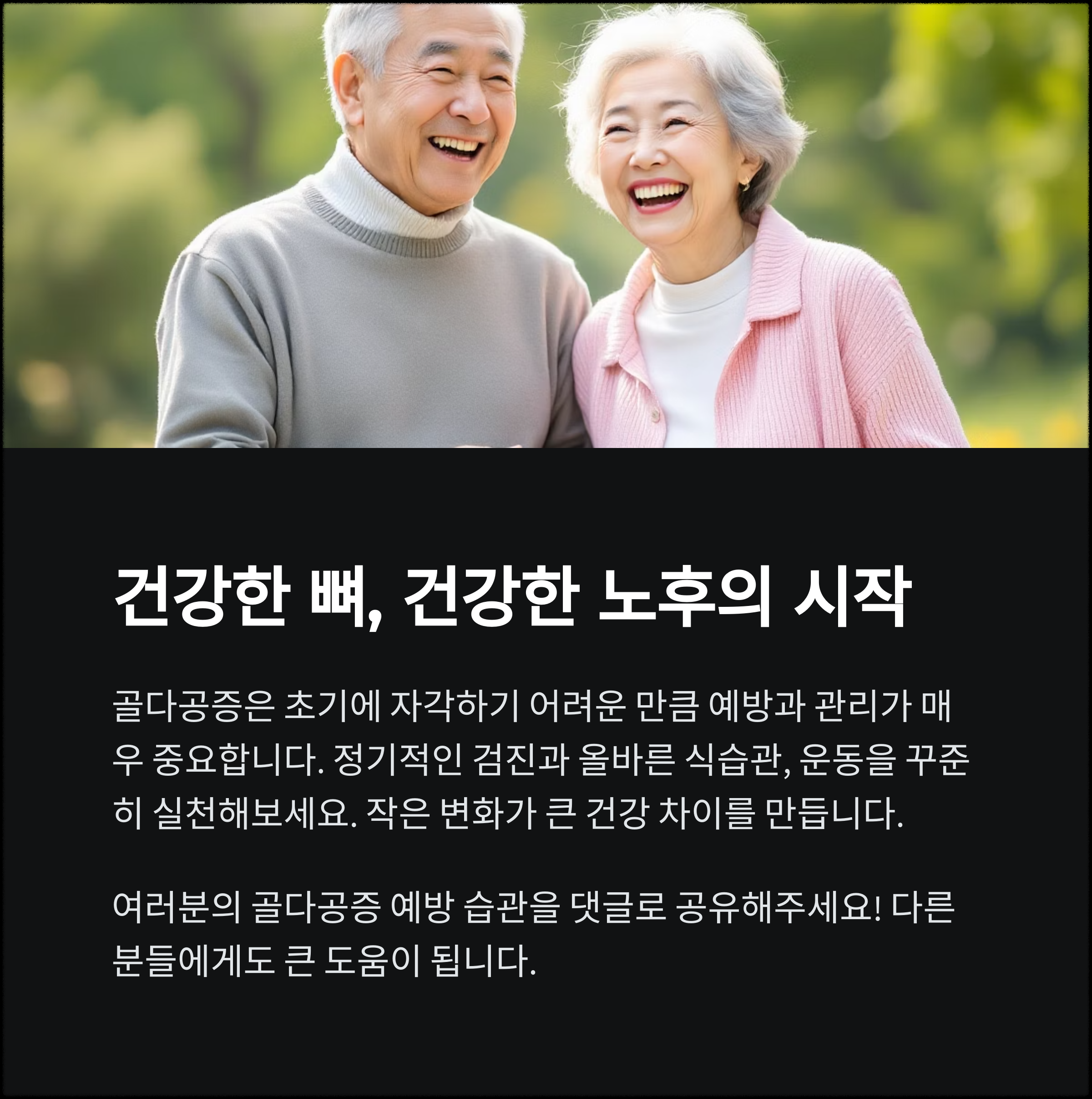 골다공증은 초기에 자각하기 어려운 만큼 예방과 관리가 매우 중요합니다. 오늘 소개한 초기증상과 예방하는 생활습관을 꾸준히 실천한다면 건강한 뼈를 유지하는 데 큰 도움이 됩니다. 특히 정기적인 검진과 올바른 식습관, 운동은 필수적인 관리 요소입니다. 지금부터라도 관심을 갖고 실천해보세요. 작은 변화가 큰 건강 차이를 만들어냅니다.