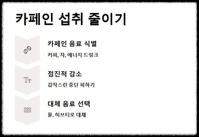 커피, 차, 에너지 드링크 등 카페인이 함유된 음료는 신경계를 자극하여 눈 떨림을 악화시킬 수 있습니다. 하루 카페인 섭취량을 점진적으로 줄여보세요.
