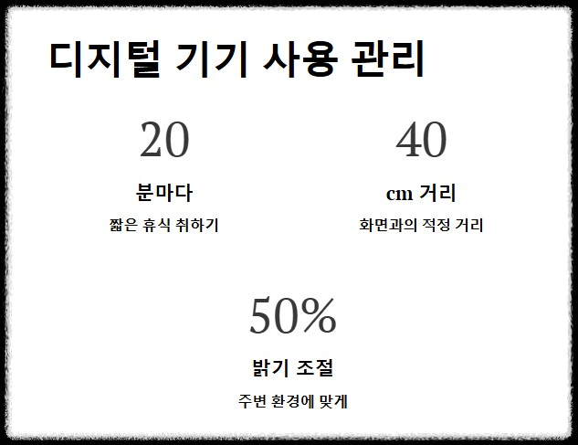 컴퓨터 작업 중 20분마다 20초 동안 20피트(약 6미터) 떨어진 곳을 바라보는 '20-20-20 규칙'을 실천하세요.