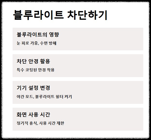 장시간 스마트폰이나 컴퓨터 화면을 보는 것은 눈의 피로를 가중시키고 눈 밑 떨림을 유발할 수 있습니다. 블루라이트 차단 안경을 착용하거나 기기의 블루라이트 필터 기능을 활용해보세요.