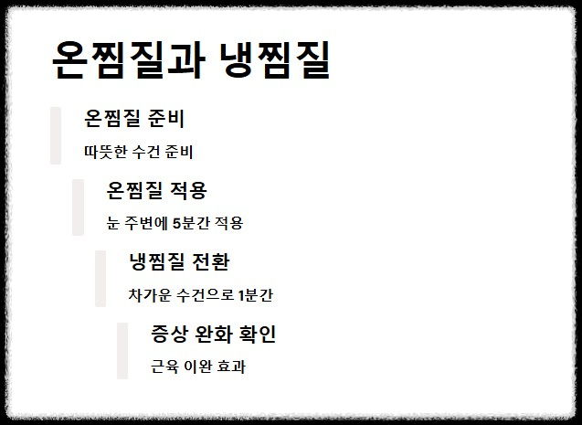 온찜질은 근육을 이완시키고, 냉찜질은 염증을 줄이는 데 도움이 됩니다. 눈 주변이 떨릴 때 따뜻한 수건으로 5분간 온찜질을 한 후, 차가운 수건으로 1분간 냉찜질을 해보세요.