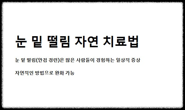 눈 밑이 갑자기 떨리는 경험을 해보신 적 있으신가요? 눈 밑 떨림은 안검 경련이라고도 불리며, 많은 분들이 일상에서 한 번쯤 경험하는 증상입니다. 이런 불편한 증상을 완화하는 자연적인 방법과 예방법을 알아보겠습니다.
