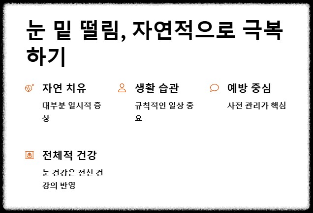 눈 밑 떨림은 대부분 일시적이고 자연적으로 해결되는 증상이지만, 적절한 자연치료법과 예방법을 통해 증상을 완화하고 재발을 방지할 수 있습니다. 규칙적인 생활 습관과 스트레스 관리가 무엇보다 중요합니다.