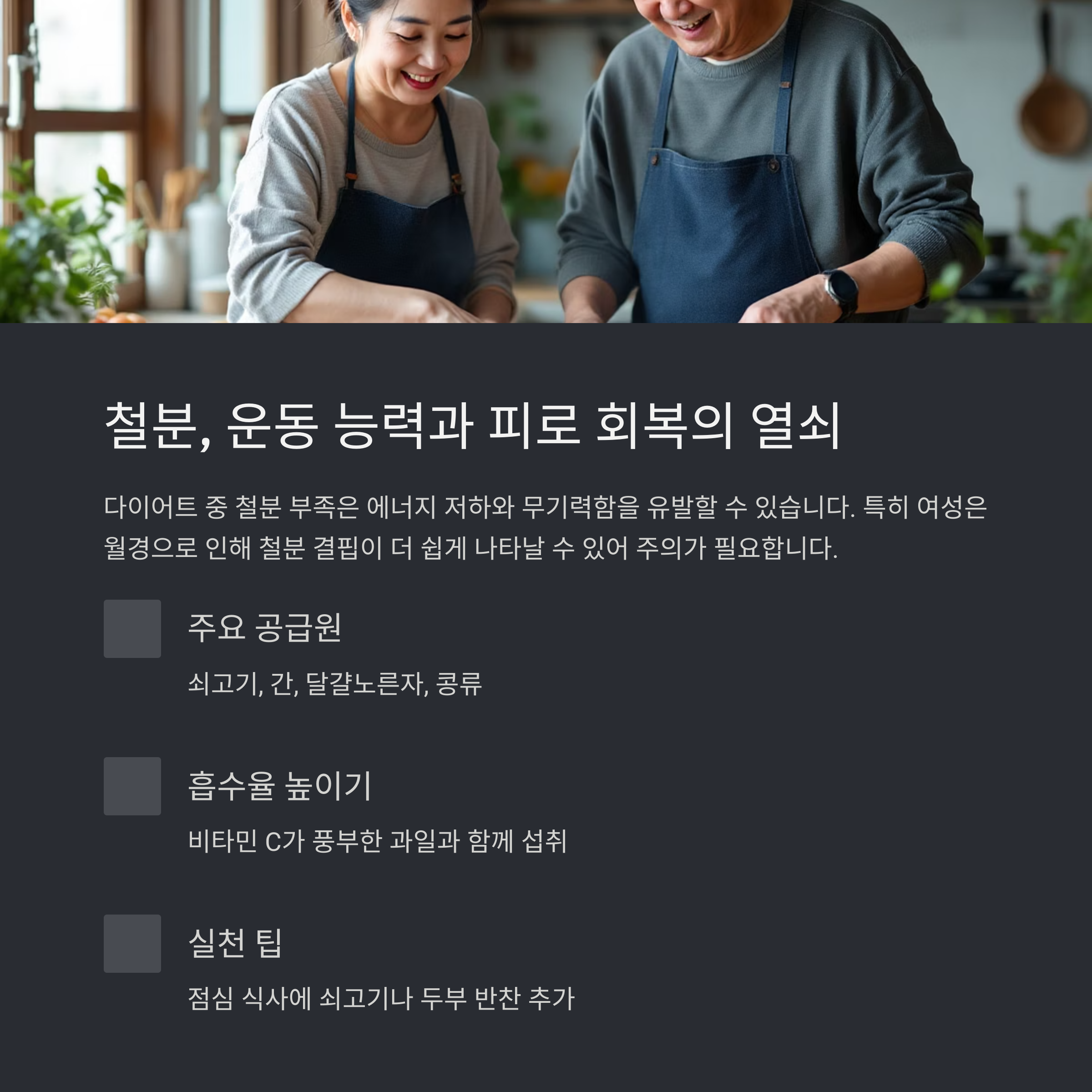 다이어트 중 철분 부족은 에너지 저하와 무기력함을 유발할 수 있습니다.