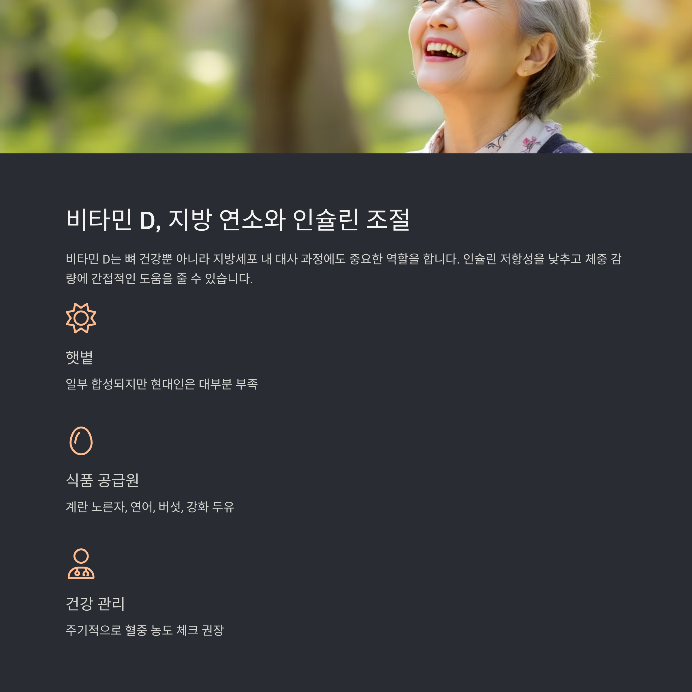 비타민 D는 단순히 뼈 건강뿐 아니라 지방세포 내 대사 과정에도 중요한 역할을 합니다.