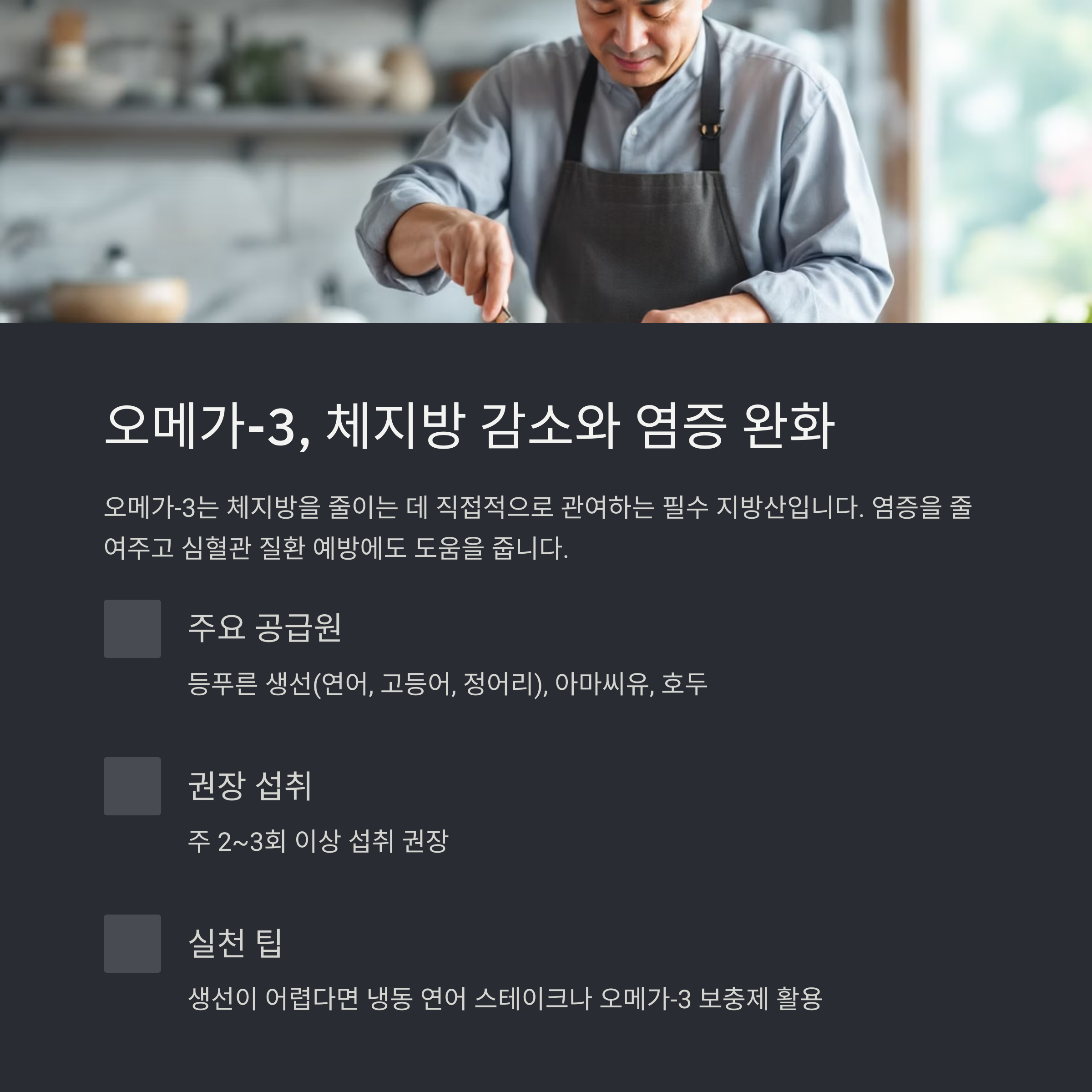 | 오메가-3 | 지방감소, 염증완화 | 연어, 아마씨유 | 주 2~3회 |