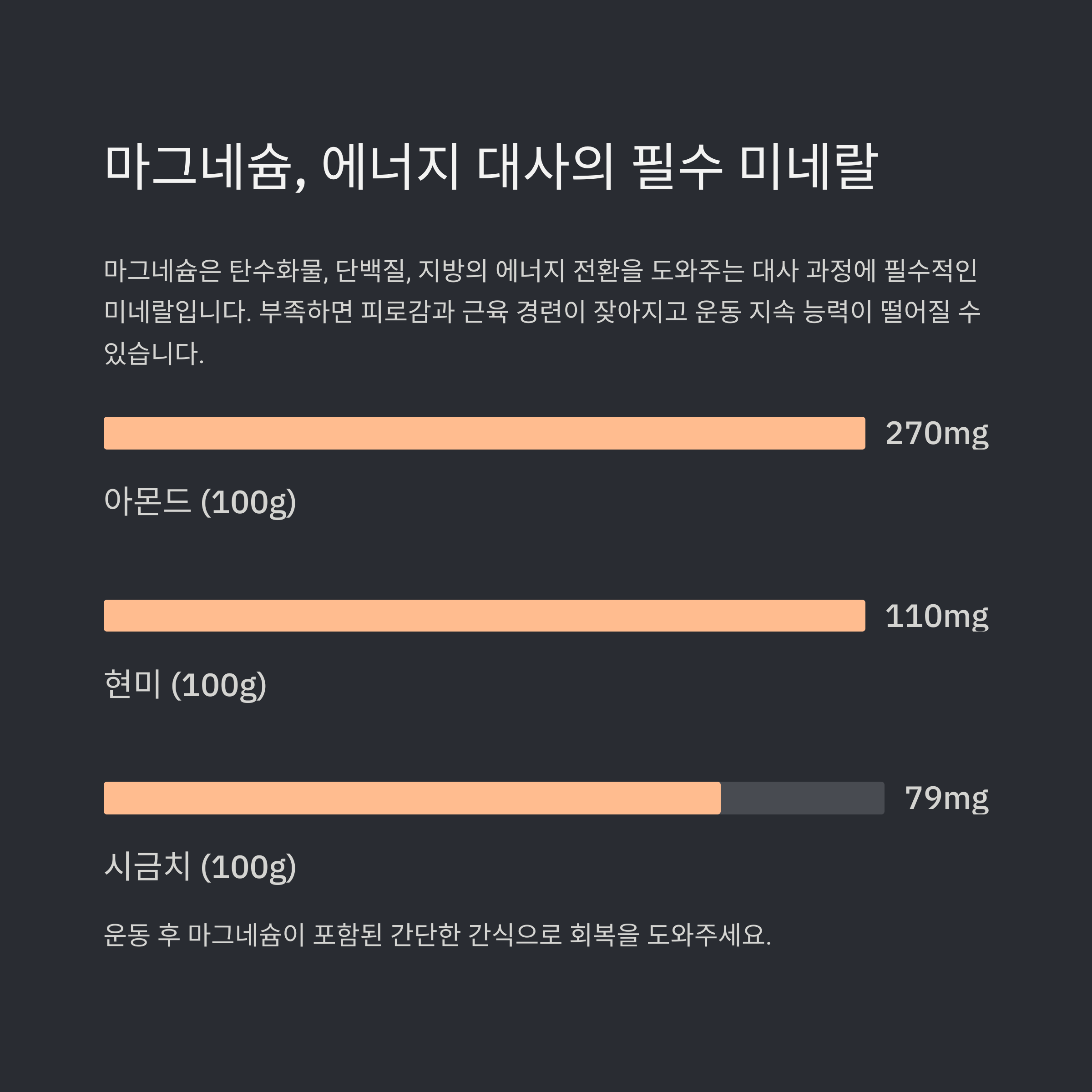 마그네슘은 탄수화물, 단백질, 지방의 에너지 전환을 도와주는 대사 과정에 필수적인 미네랄입니다.