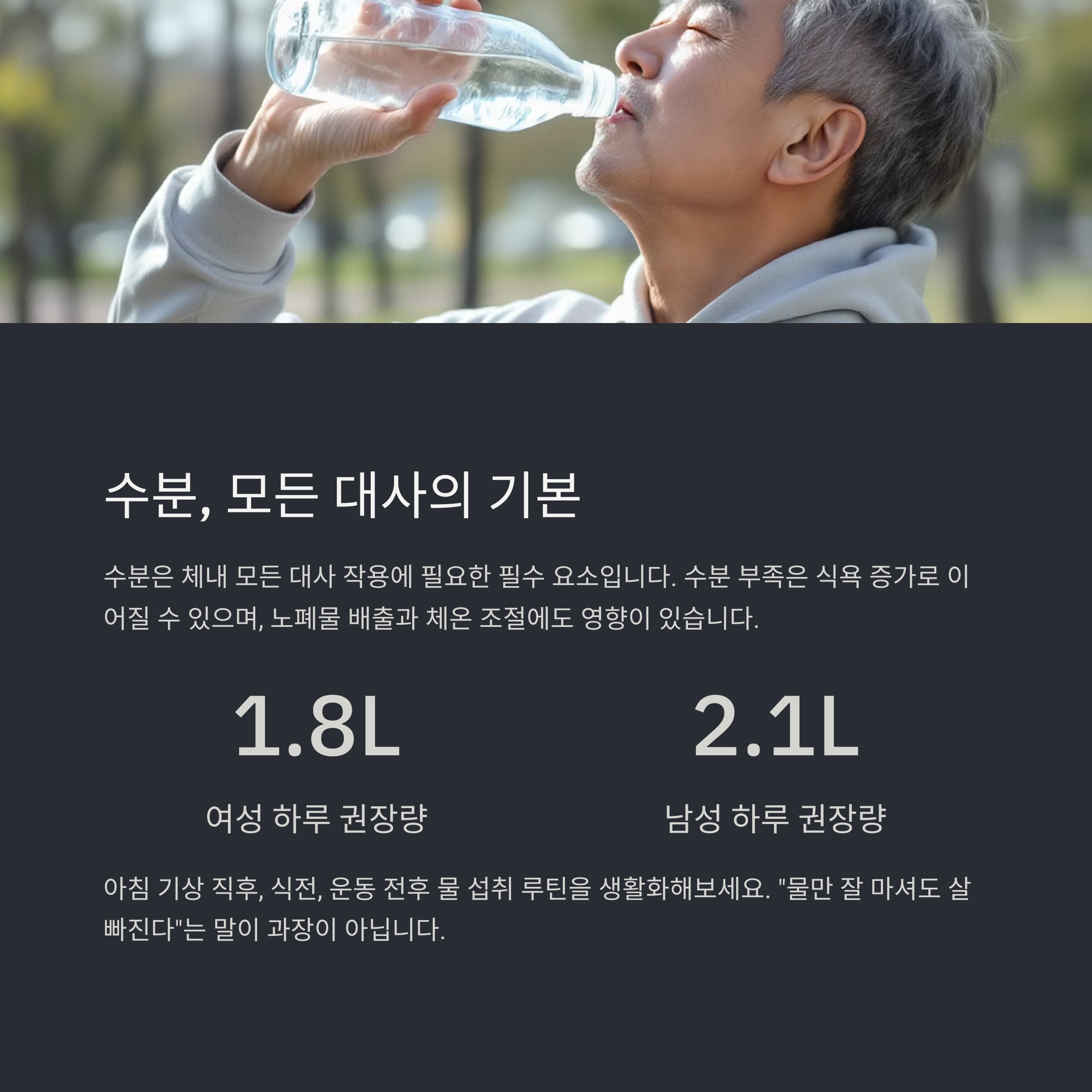 수분은 체내 모든 대사 작용에 필요한 필수 요소입니다.
