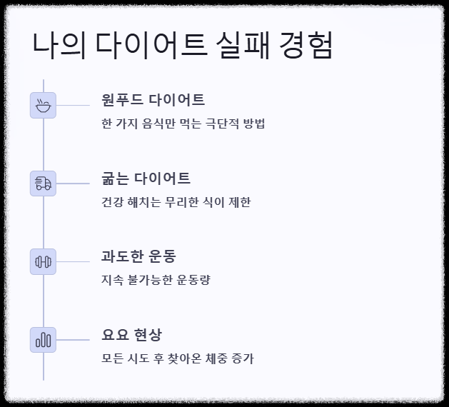 저 또한 수많은 다이어트 실패를 경험했습니다. 굶거나, 한 가지 음식만 먹는 원푸드 다이어트, 심지어는 극단적인 운동까지 시도해봤지만, 결과는 항상 똑같았습니다. 잠깐의 체중 감량 후 찾아오는 엄청난 요요 현상. 하지만 포기하지 않고 끊임없이 연구하고 노력한 끝에, 마침내 건강하고 지속 가능한 다이어트 방법을 찾았습니다.