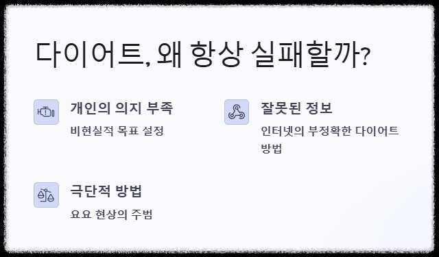 다이어트는 현대인의 영원한 숙제와 같습니다. 수많은 사람들이 다이어트에 도전하지만, 성공하는 사람은 극히 드물죠. 왜 우리는 매번 다이어트에 실패하는 걸까요? 그 이유는 개인의 의지 부족, 잘못된 정보, 비현실적인 목표 설정 등 다양합니다. 특히, 인터넷에 떠도는 잘못된 정보는 다이어트 실패의 주범입니다. 극단적인 식단 조절이나 무리한 운동은 건강을 해칠 뿐만 아니라, 요요 현상을 불러일으키기 쉽습니다.