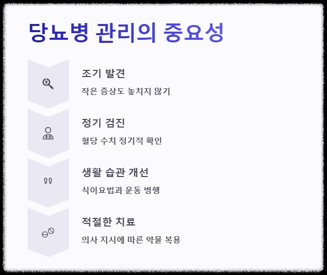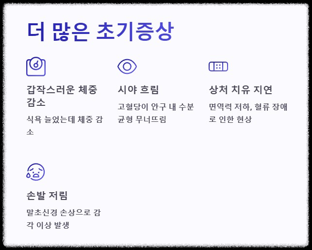 하지만, 이 시기를 놓치면 혈당이 만성적으로 높은 상태가 지속되면서 혈관, 신경, 심장, 신장 등 다양한 장기에 치명적인 합병증을 유발할 수 있습니다. 따라서 초기증상을 정확하게 알고, 의심 증상이 있을 경우 즉시 진단과 치료를 받는 것이 중요합니다.