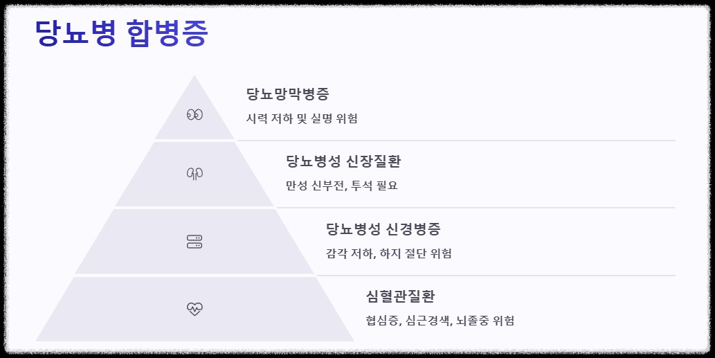 - 심혈관질환: 고혈당은 혈관에 손상을 줘 협심증, 심근경색, 뇌졸중 위험 증가