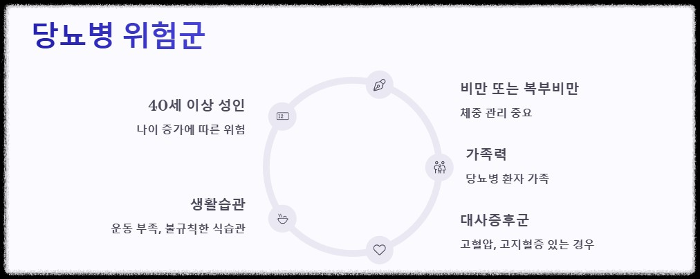 다음에 해당하는 사람들은 당뇨병 발생 가능성이 높기 때문에 정기적인 혈당 검진이 권장됩니다.