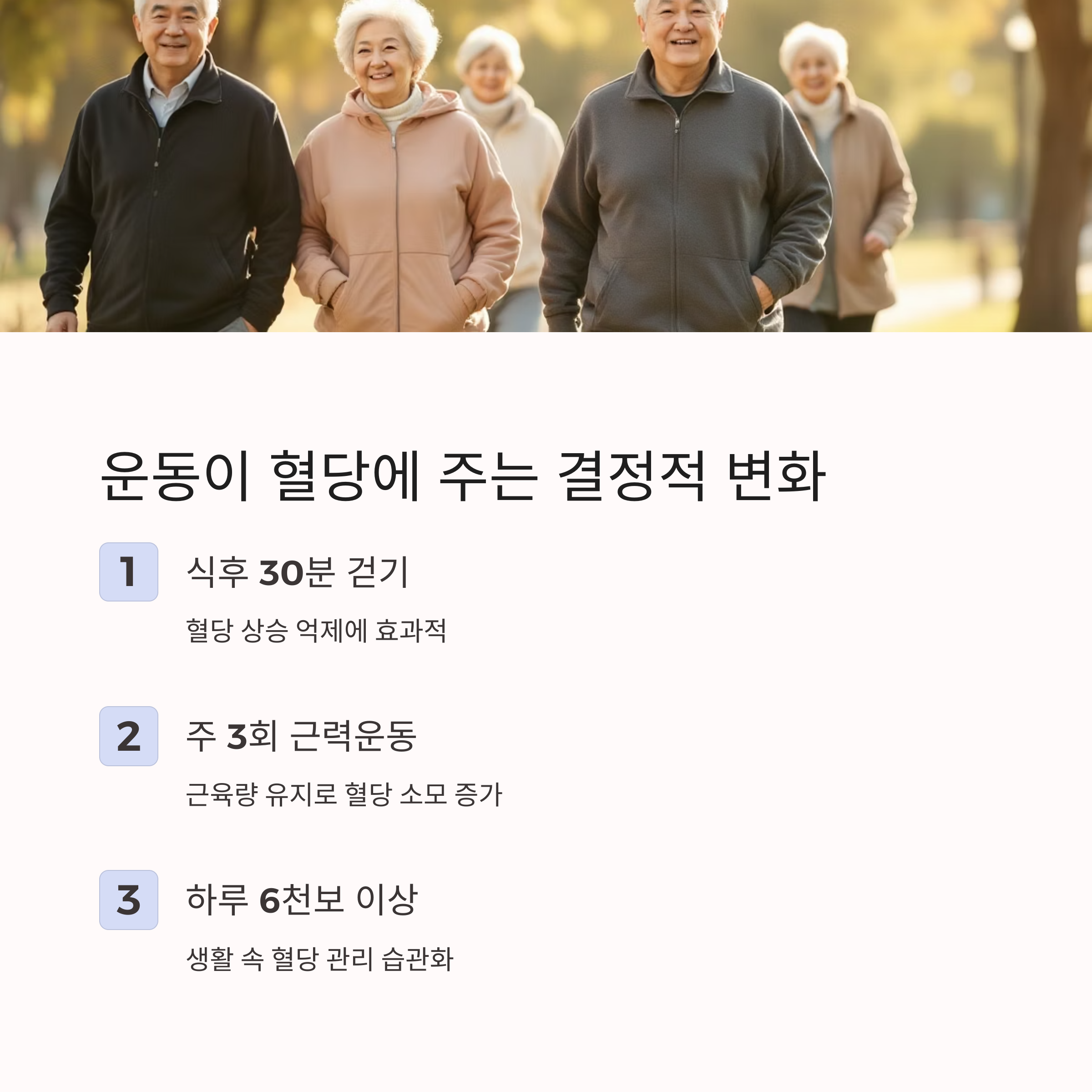 - 하루 6천보 이상 걷기: 생활 속 혈당 관리 습관화
