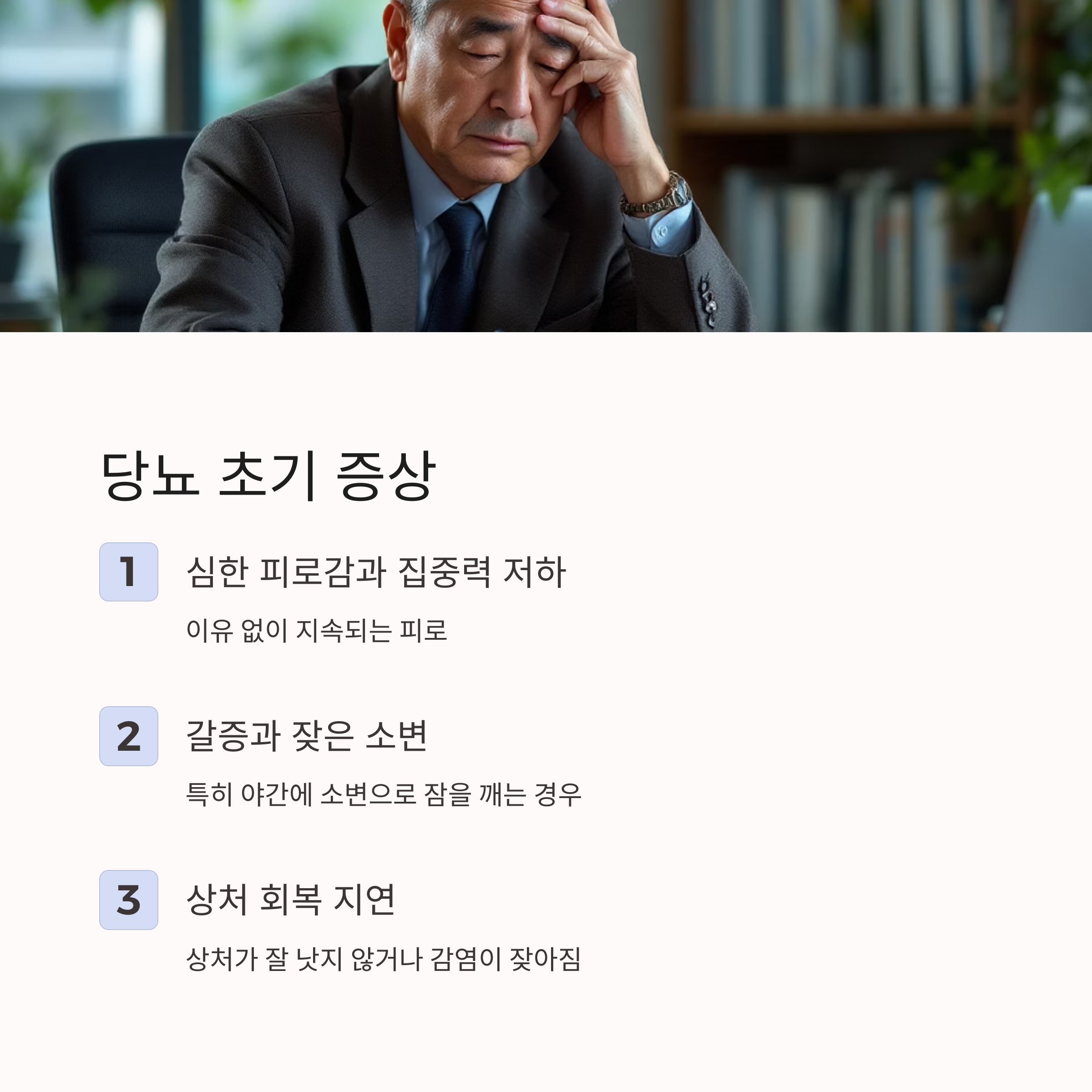 당뇨병의 초기 단계는 ‘무증상’이라 불릴 정도로 자각이 어려운 경우가 많습니다. 하지만 다음과 같은 증상은