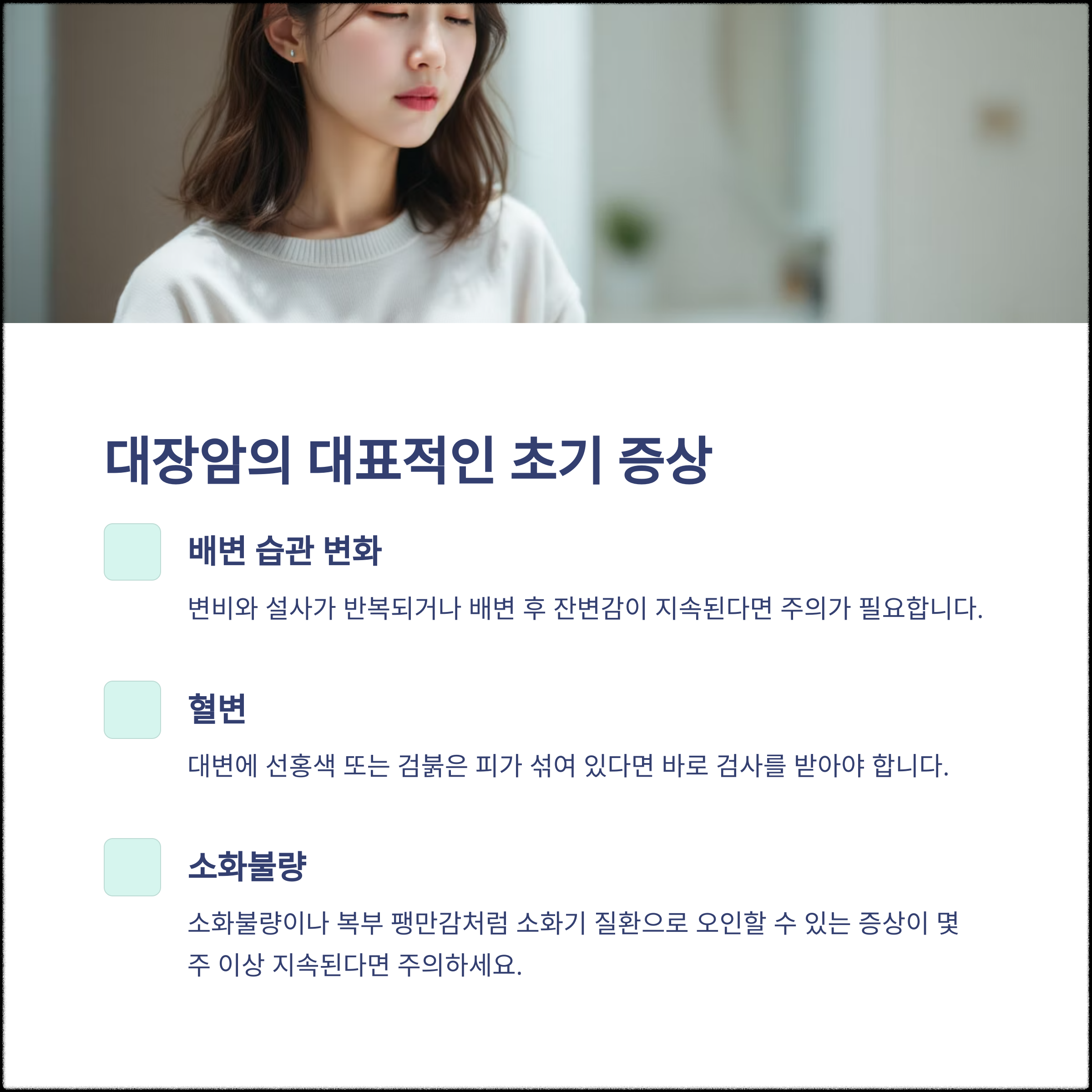 배변 습관 변화, 복통, 혈변, 체중 감소 | 반복되는 소화불량, 가늘어진 변, 잔변감 | 40세 이상, 가족력 있으면 내시경 검사 필요 |