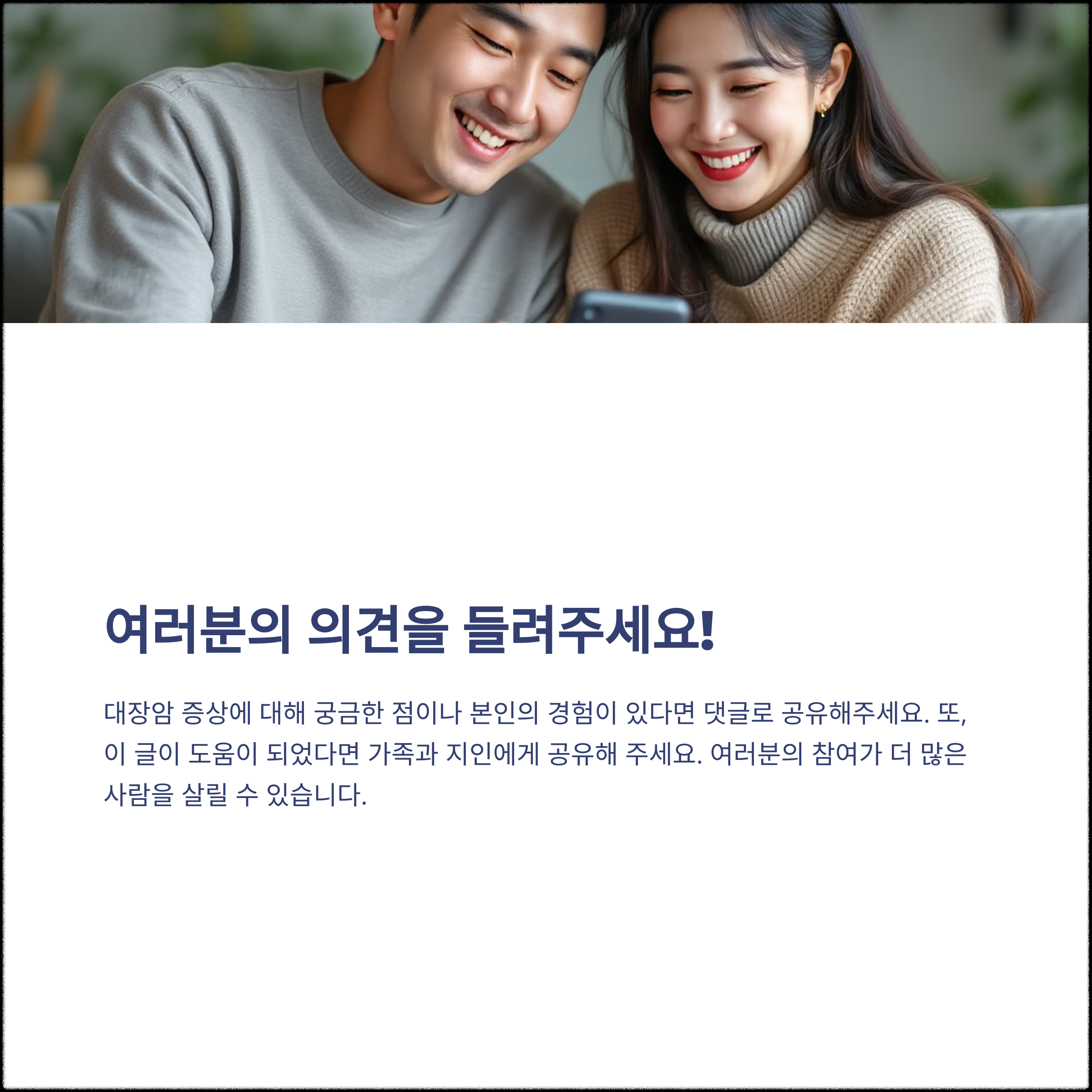 대장암 증상에 대해 궁금한 점이나 본인의 경험이 있다면 댓글로 공유해주세요. 또, 이 글이 도움이 되었다면 가족과 지인에게 공유해 주세요. 여러분의 참여가 더 많은 사람을 살릴 수 있습니다.