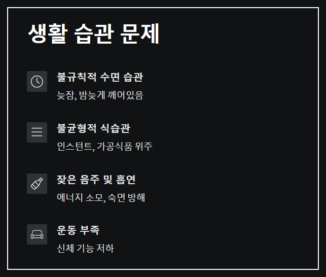 불규칙적인 수면 습관 : 늦잠을 자거나 밤늦게까지 깨어있는 생활은 수면 부족을 유발하고 만성 피로로 이어질 수 있습니다.