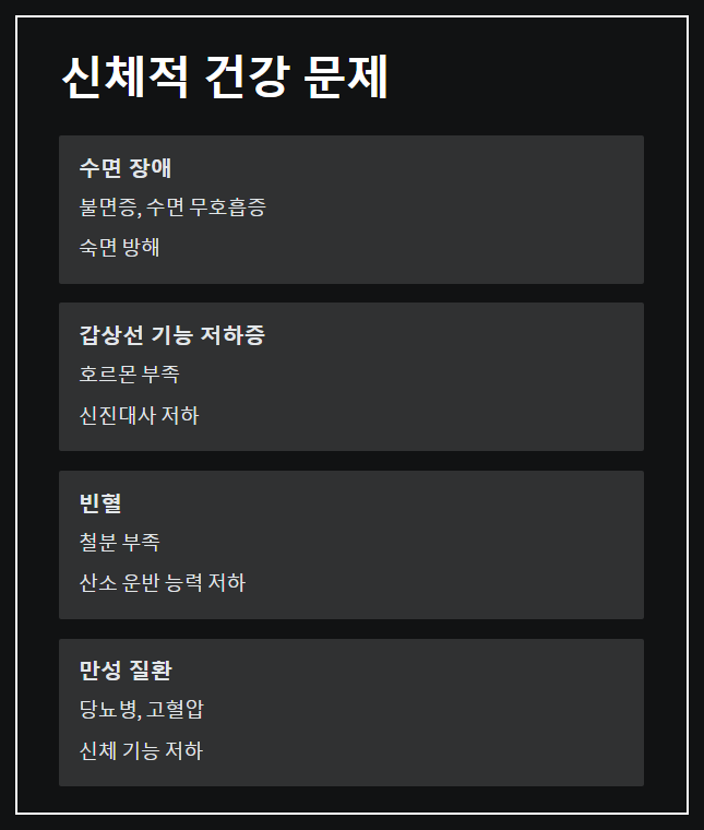 스트레스 : 과도한 스트레스는 신체적, 정신적 피로를 증가시키고 만성 피로를 유발합니다.