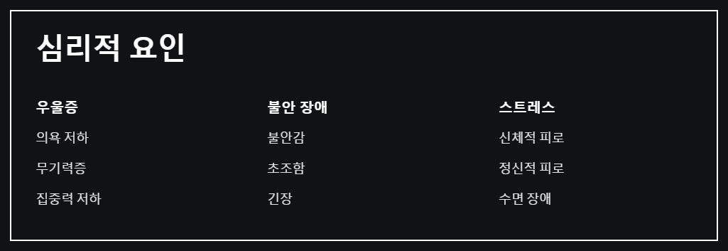 우울증 : 우울증은 의욕 저하, 무기력증, 집중력 저하를 유발하여 만성 피로를 악화시킵니다.