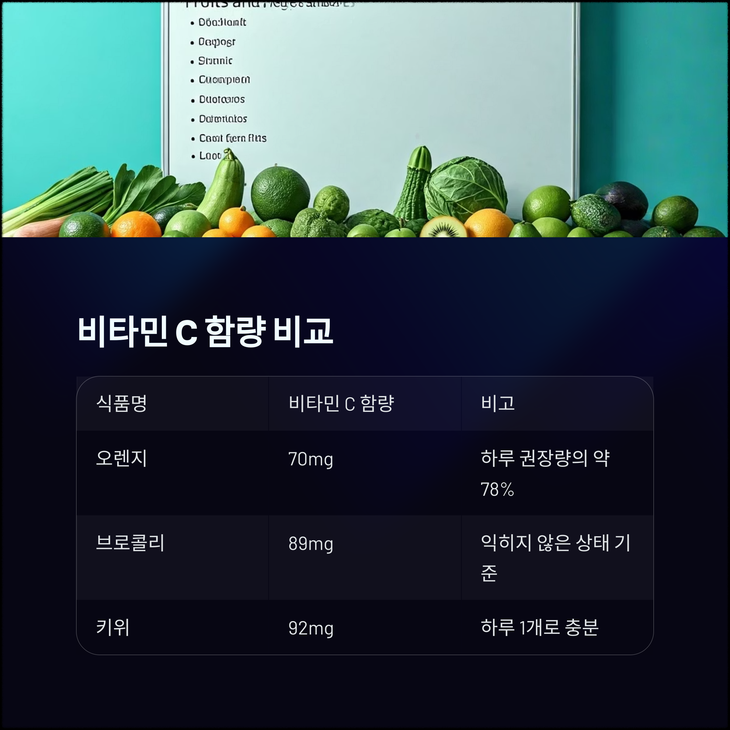 2. 대표 식품은 오렌지, 브로콜리, 키위 등입니다.